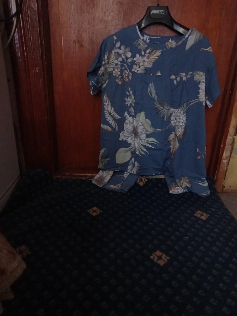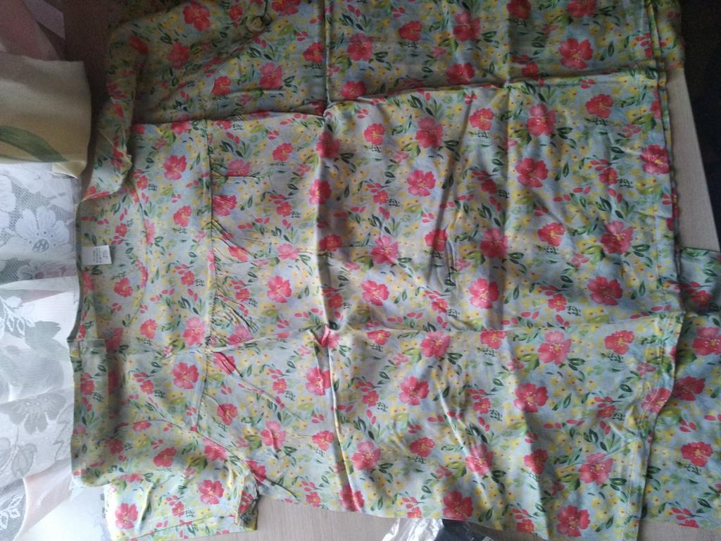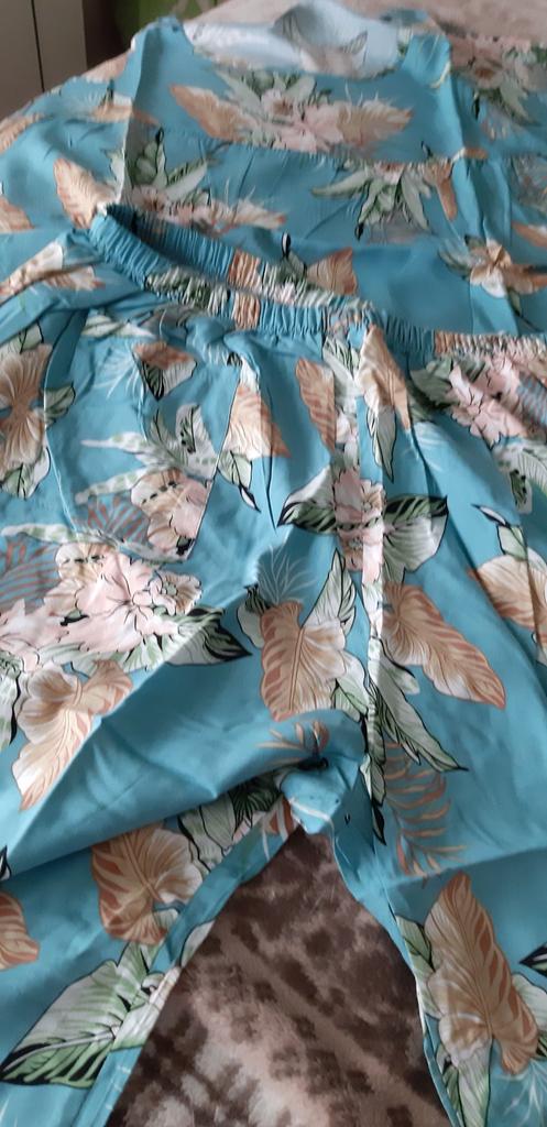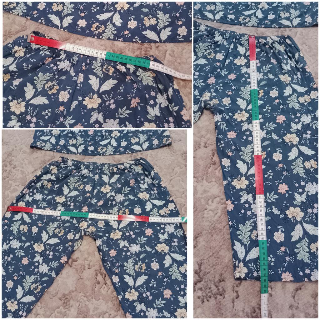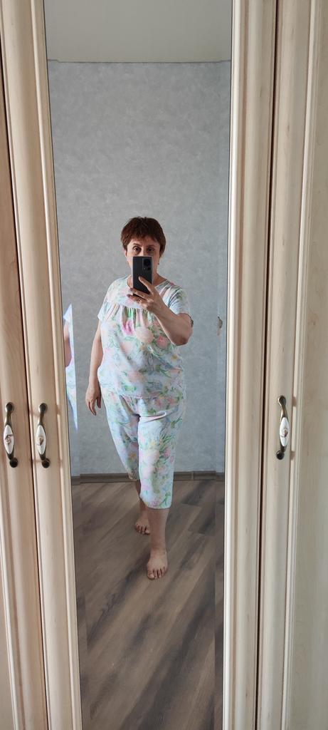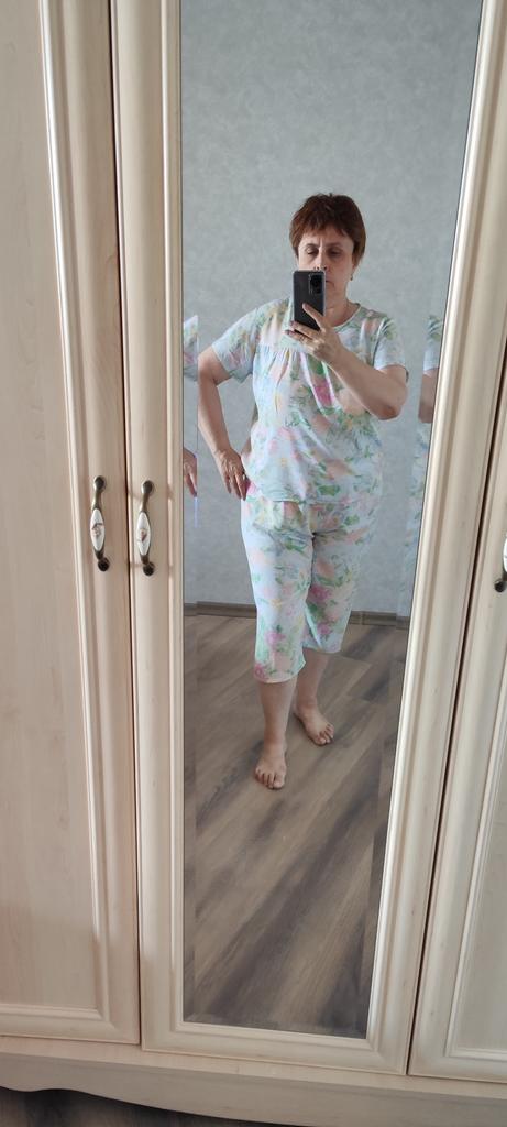 Perfect for summer pajamas - thin, very light and pleasant material! Size XXXXL blouse for European No. 44 is good, but the top of the pants is too short - you probably need to find a suitable piece of fabric and sew it longer.