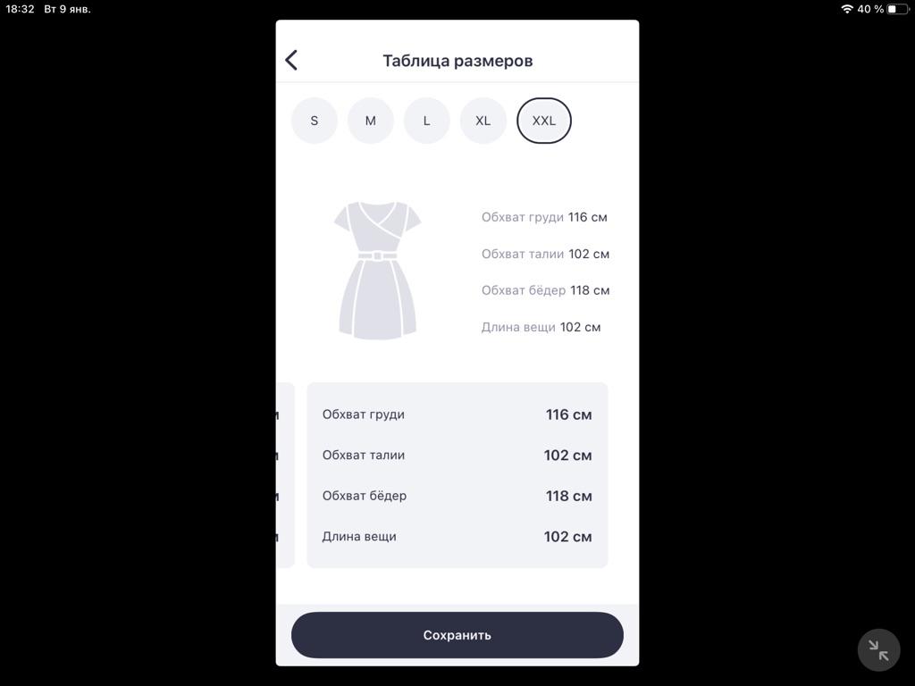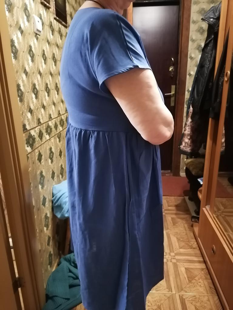 My size is 44-46. The dress is short, knee-length, cuts under the armpits, uncomfortable cut