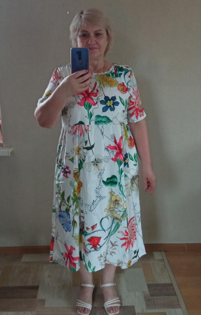 at 48-50 it’s too loose, it looks good on flat-chested models, but on real women it looks like a maternity dress.
