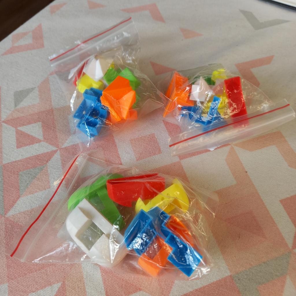 Pieces. Thin. Colors are pleasant, bright. I'll find a bag or box for the puzzles so they don't get lost, and then I'll unpack them.