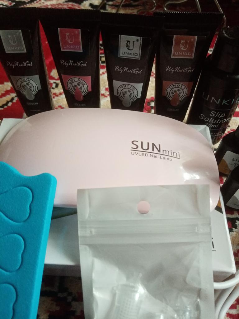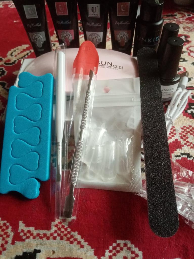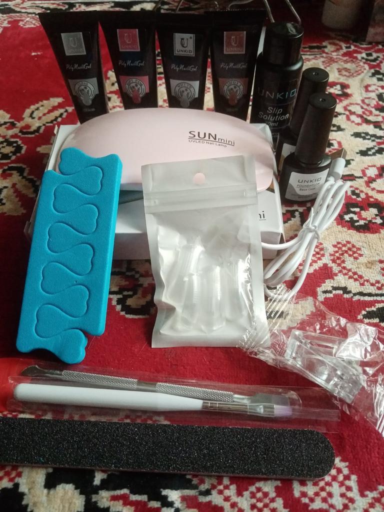 1Pc Poly nail gel +1Pc Slip Solution+1pc top coat+1pc base coat +1Pc 6W USB LED Lamp+ 1pc brush+1pc nail steel push+1pc nail file+20pcs nail tips+1pc nail clip + 1pc Toe separator