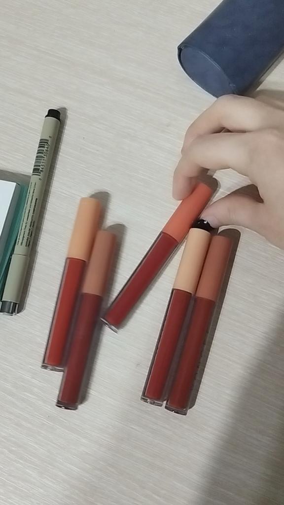 beautiful lipsticks, at first glance the colors are very different, just like in the photo, but in reality they are not radically different, it's just the difference in shades by several tones. it's not bad, you just have to consider that the colors go from red-carrot to maroon-brown. the lipsticks smell delicious like shortbread, apply a little with spots, but after some time of use you get used to applying an even layer. after application, it hardens and becomes a little sticky, but the main thing is not to smack your lips and let it dry for a while (3-7 min) and then it is a completely stable matte lipstick, it is accepted well, but if you eat with it or lick your lips, it smears a little , but it is not fatal, and I would say it is not surprising, because after eating or kissing you still need to touch up any lip makeup. I am very satisfied with the product