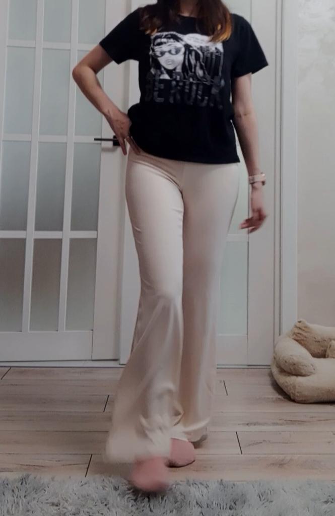 Just WOW Stretchy, but look like normal pants, fit perfectly, the flare looks very nice, the length is a little too long for me, but I have short legs, overall I definitely recommend them, comfortable as home pants but you can wear them anywhere