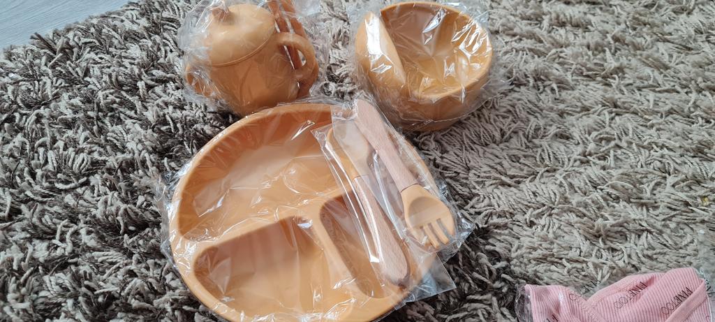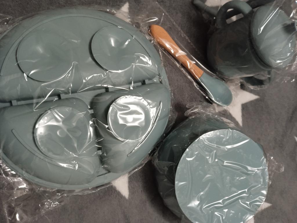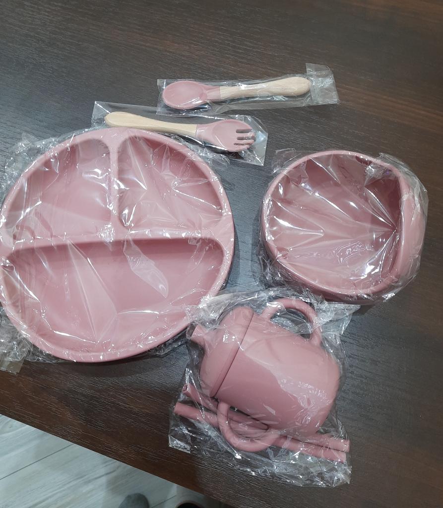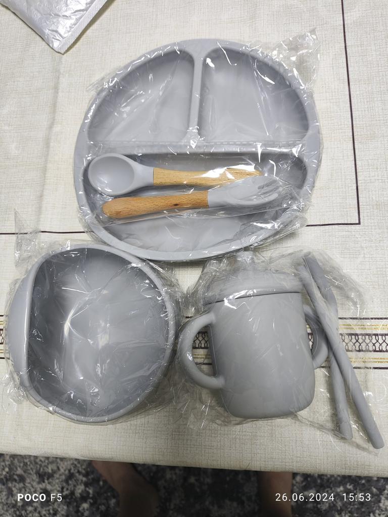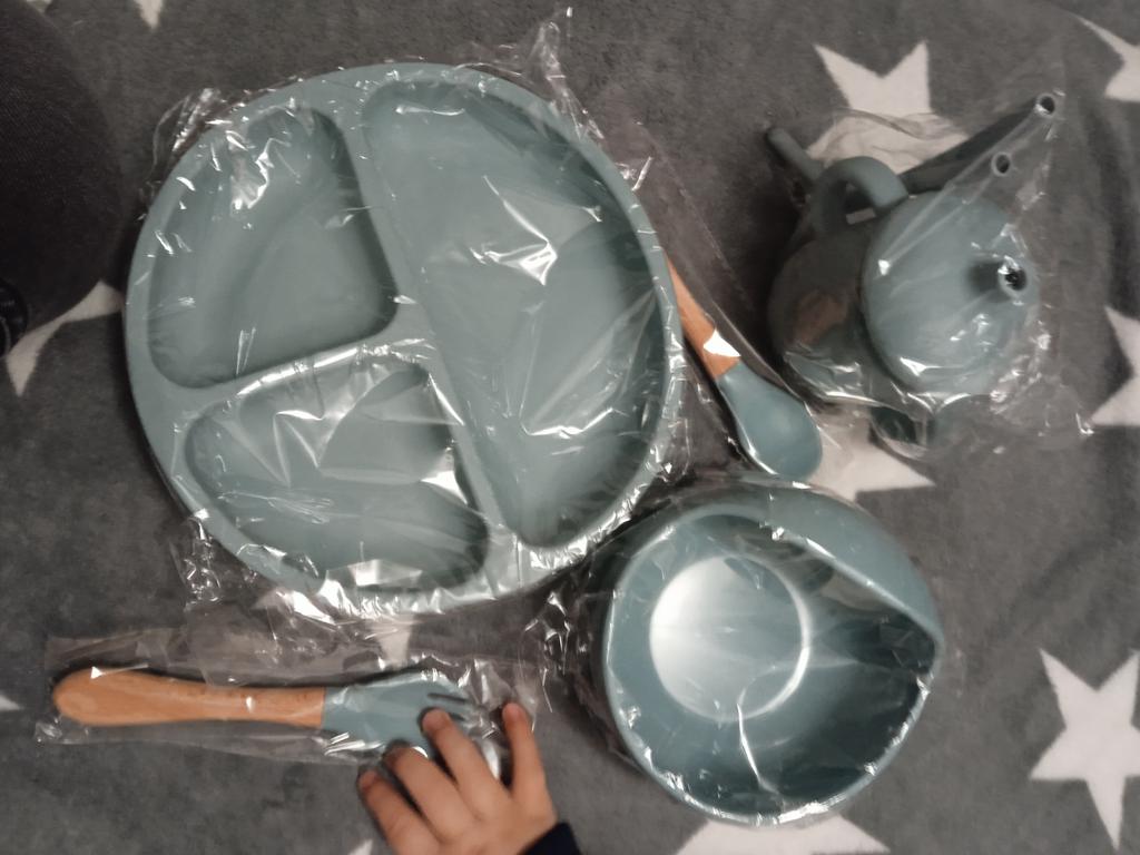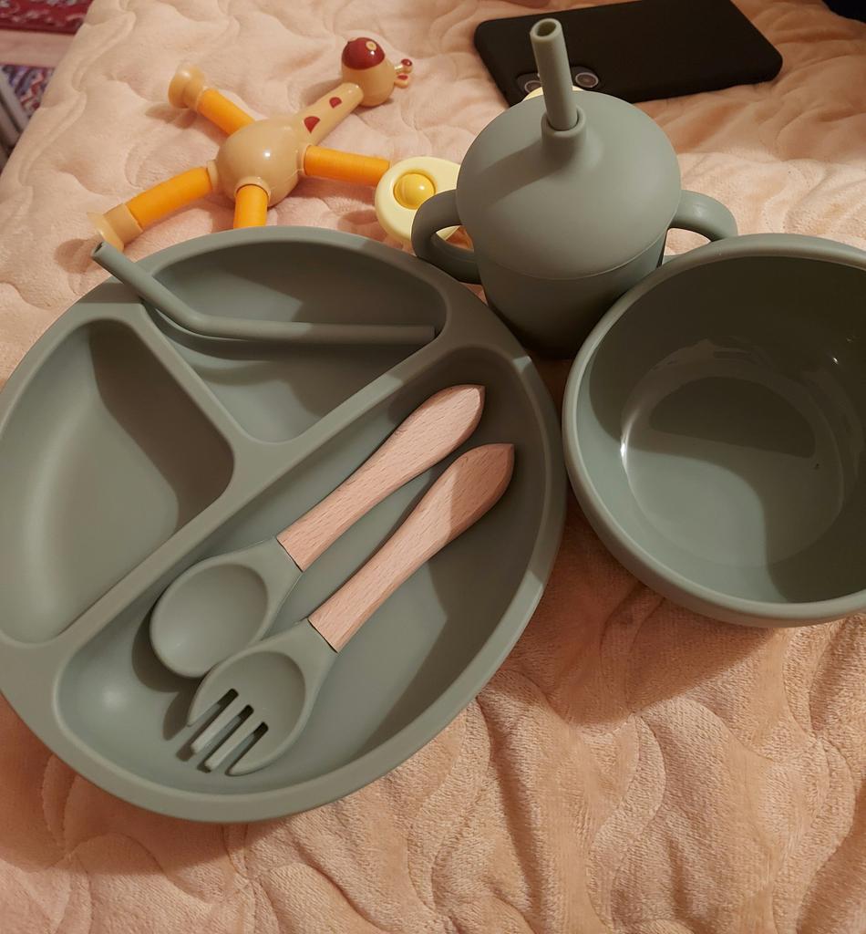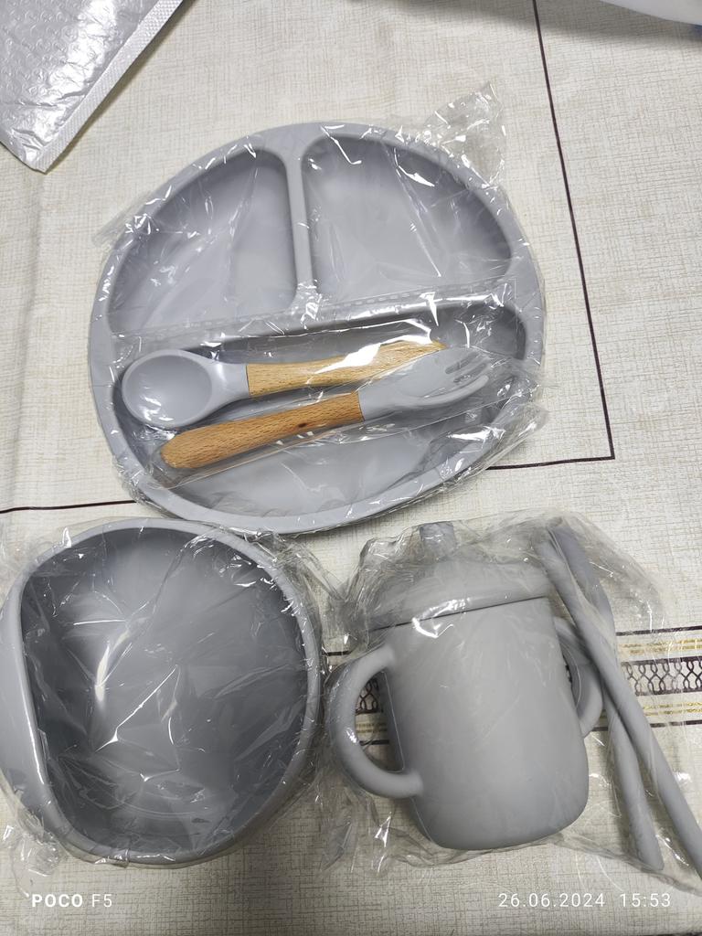 A wonderful set of dishes 🥰 no smell, comfortable, sticks well to the surface, everything is soft and safe😍 The goods arrived very quickly - less than 2 weeks, sent quickly. At this price, you can probably buy only 1 plate with utensils from us, so I highly recommend buying it ;)