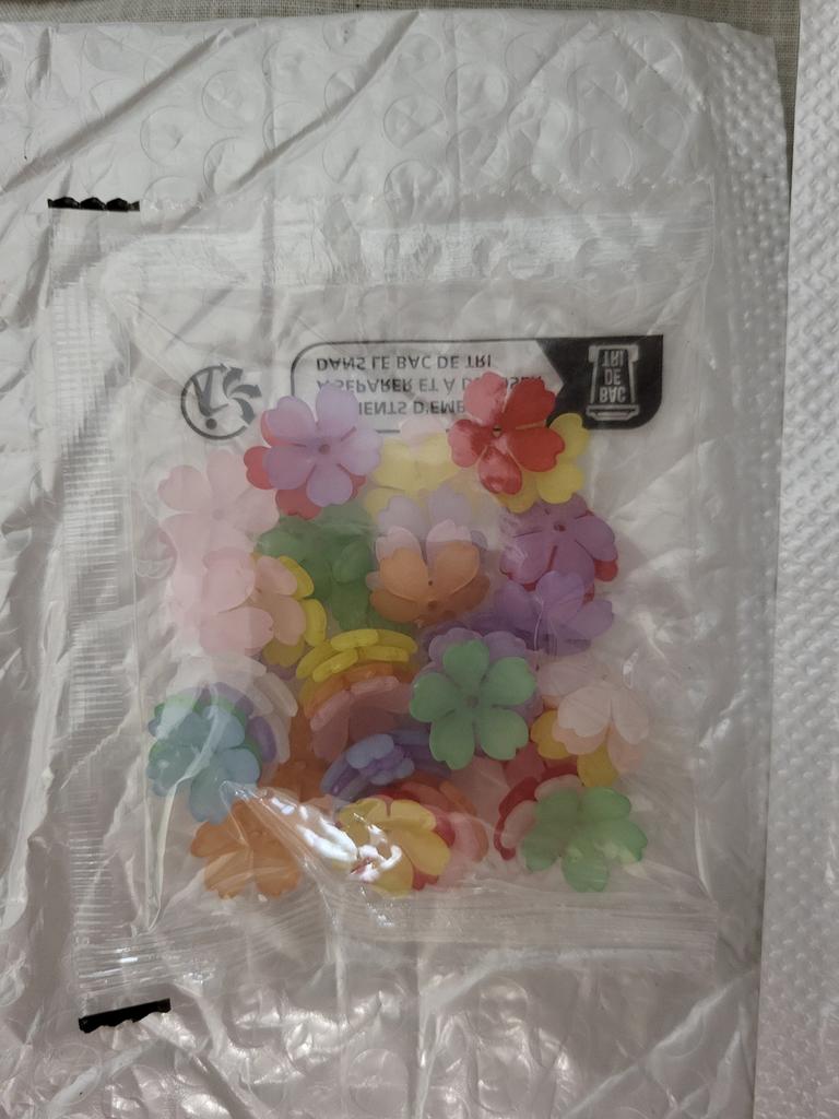 Pretty, cute little flowers, tiny, but that’s good, that’s exactly what was needed. The color is not bright, rather pastel. The middle has a hole, you can sew it on. But I still plan to attach it with hot glue.