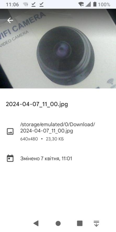 4 04 (first attempt) ...Trying to connect throws me out of the app... Constant advertising in the recommended application that completely covers the phone screen... Why does the camera battery last only a few minutes? And he takes the charge as if he didn't own it... I will try to connect again later... 5 04 (second attempt) ... It turned out that the phone must be unlocked from the Internet when working with the camera (because advertising will not allow the application to work! And this is a big drawback!!!). It continues to charge (that is, the battery cannot be fully charged for some reason...). I will try to figure it out and make the camera work for at least some adequate time (without charging wires!!!) in real time and via the Internet... Probably the camera was created for something other than camera work:))! I will report on successes and failures! And so far one star, unfortunately and very unfortunate :(... 7 04 (third attempt) Connected ... The picture is snowing a little ... The camera does not focus, that is, it will not work to focus on something. I tried to use it as something like a webcam and nothing worked. I want to say about the size of the photo. Here is a reference photo whose data is 720p (HD): 1280 x 720. But the description says 720p, but I’m actually giving a screenshot... It’s 640 x 480 ??? The video plays only in the application ... MP5 format :)! Judging by the size of the photo, the wrong camera was delivered to me... Unfortunately... And the fastening is not the same as in the photo of the store (I attached the photo!)... They must have mixed it up!