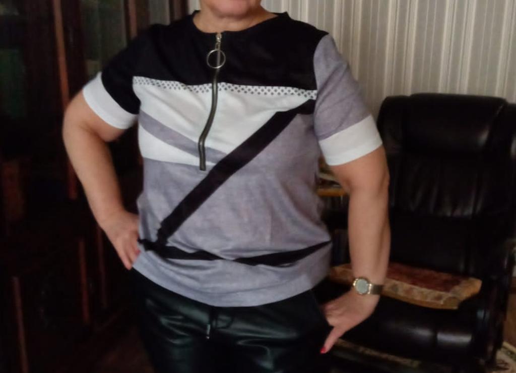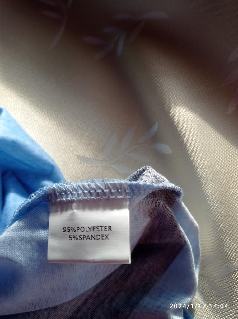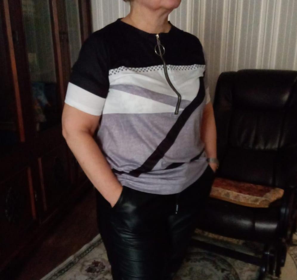 The size is quite small (about L) and the style is not the same as in the photo. Short and narrowed to the bottom T-shirt completely tight (((Synthetics are very unpleasant to the body. I do not recommend this thing. I am satisfied with the other two.