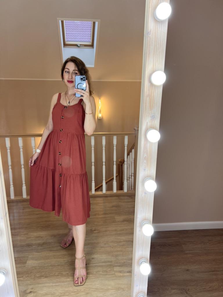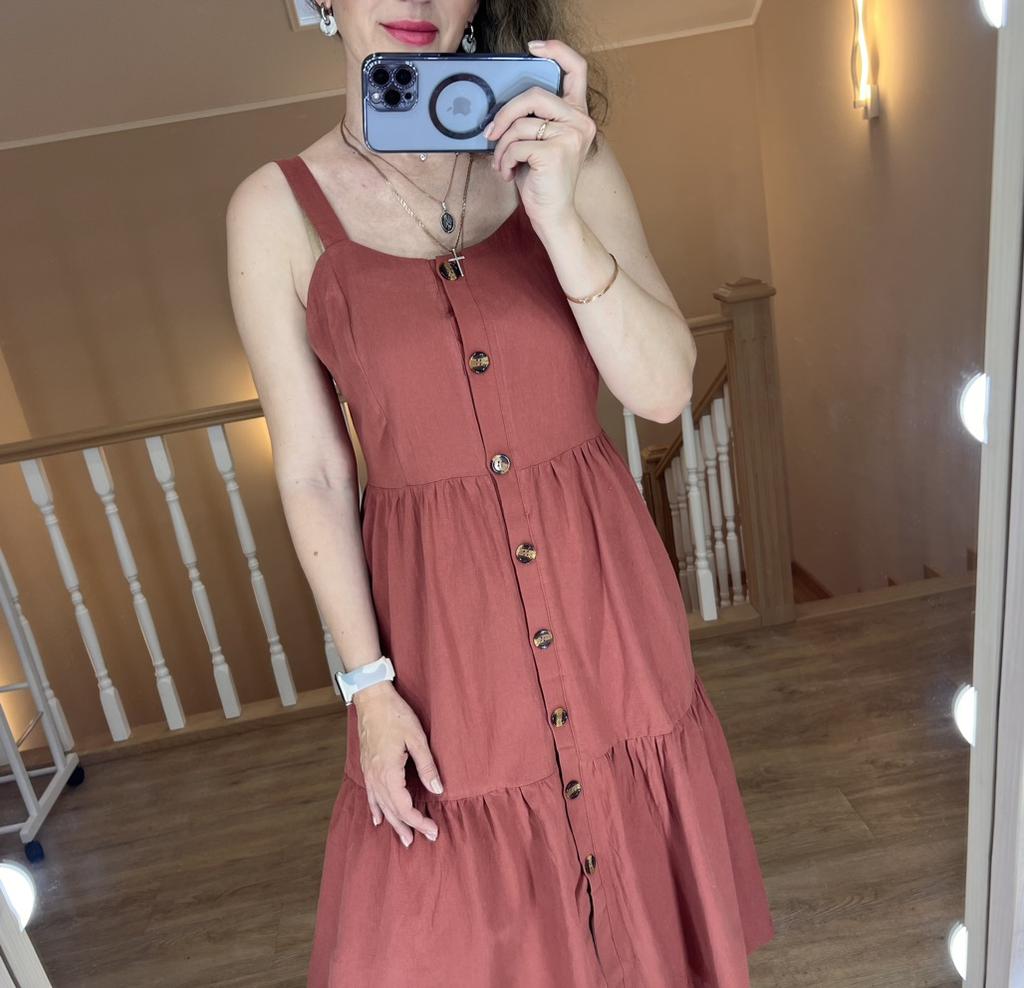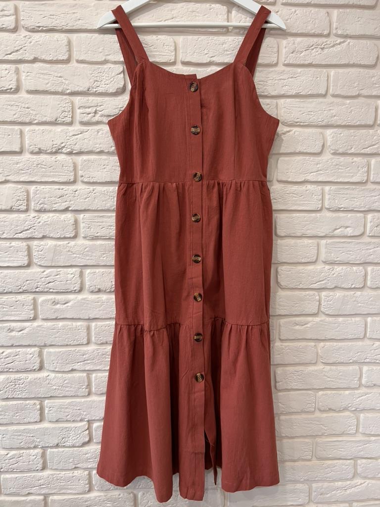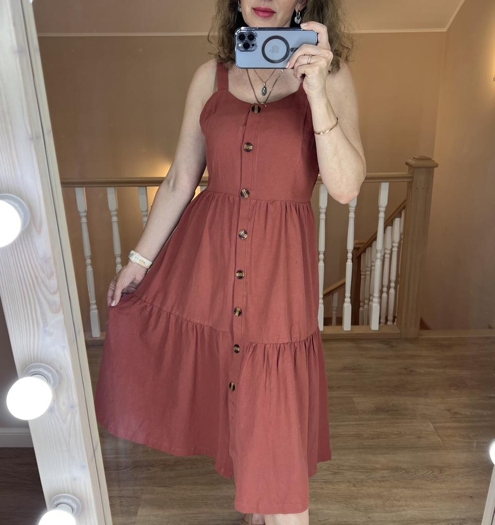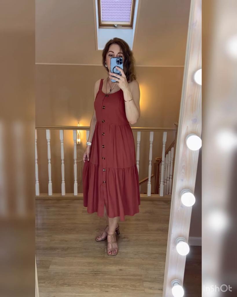 SLEEVELESS summer chick ๐ ๐ ๐Delivery time ๐: 15 days to Germany. ๐Scope of delivery ๐: The scope of delivery includes a dress ๐ in the appropriate size. There is only one color to choose from (brown). The page says the color is red, but it's more brown or something in between red and brown. It is available from size S to XL. I ordered it in S and the dress ๐ fits me great! I usually wear size 36-38. I weigh 55kg over 167cm. ๐Quality ๐: The dress is casual and opaque. With buttons that you can open. It is true to size ๐๐๐๐ The dress is about mid-calf on me . The product has excellent quality: 65% polyester and 35% cotton. Perfect for summer!!๐๐๐๐๐ ๐ The dress ๐ will be perfect for the beach ๐ I particularly like the design of the dress, namely that you can unbutton dress ๐. Looks very elegant and seductive.๐ Thank you Joom and seller Hi Dawn!๐5 stars! ๐ I would be happy to recommend the dress!๐๐