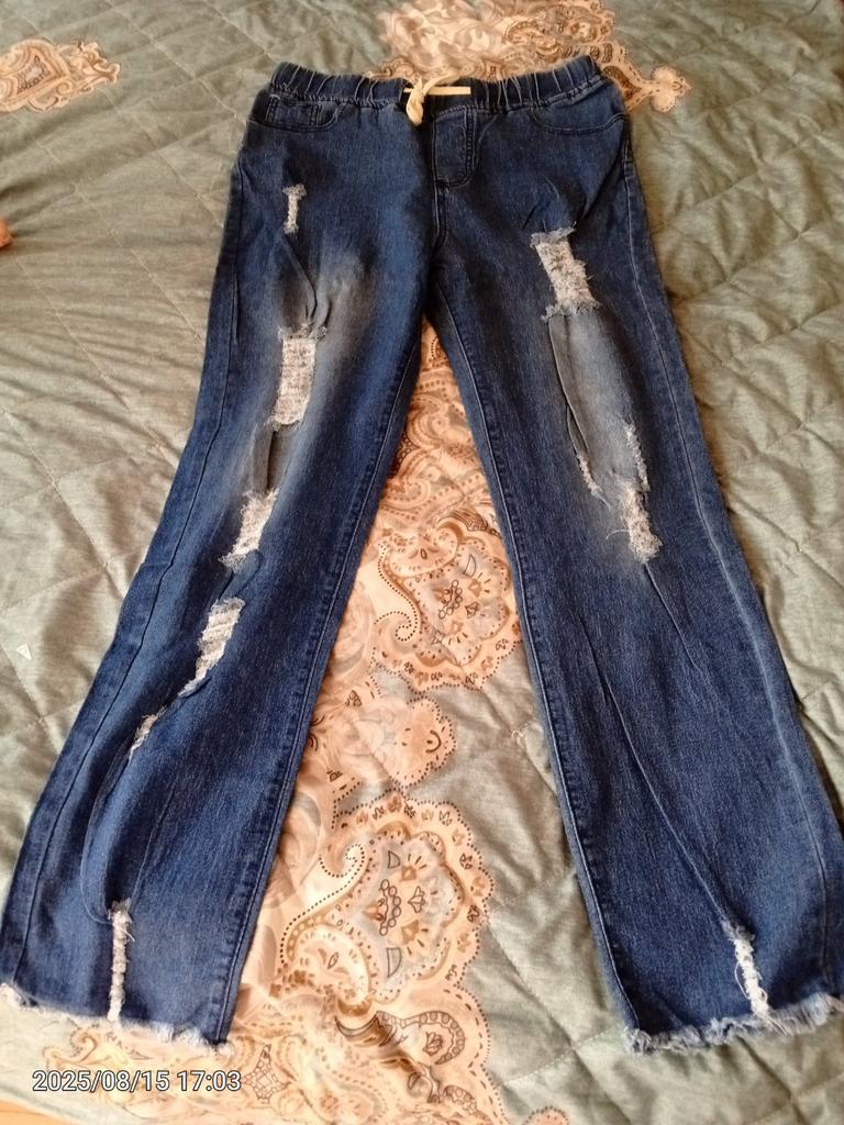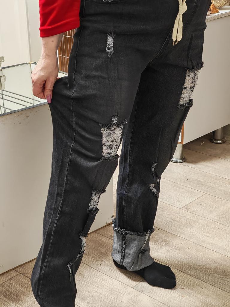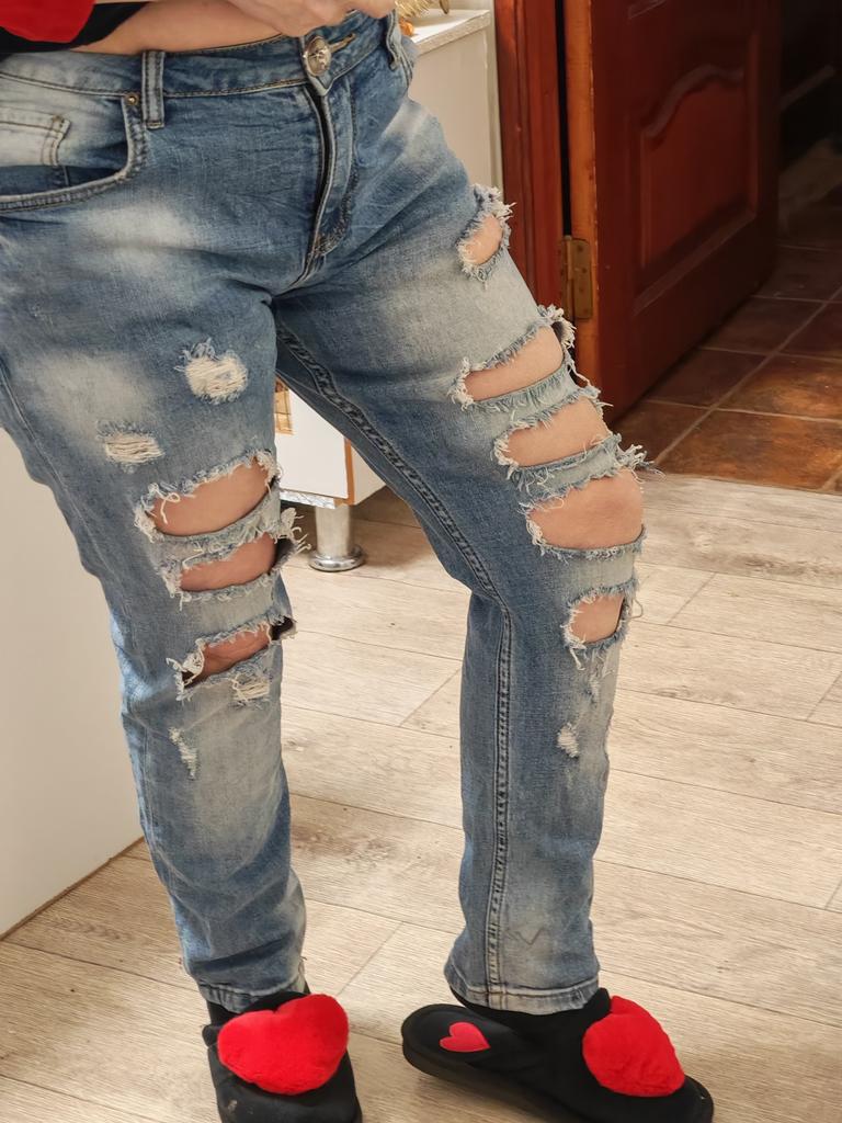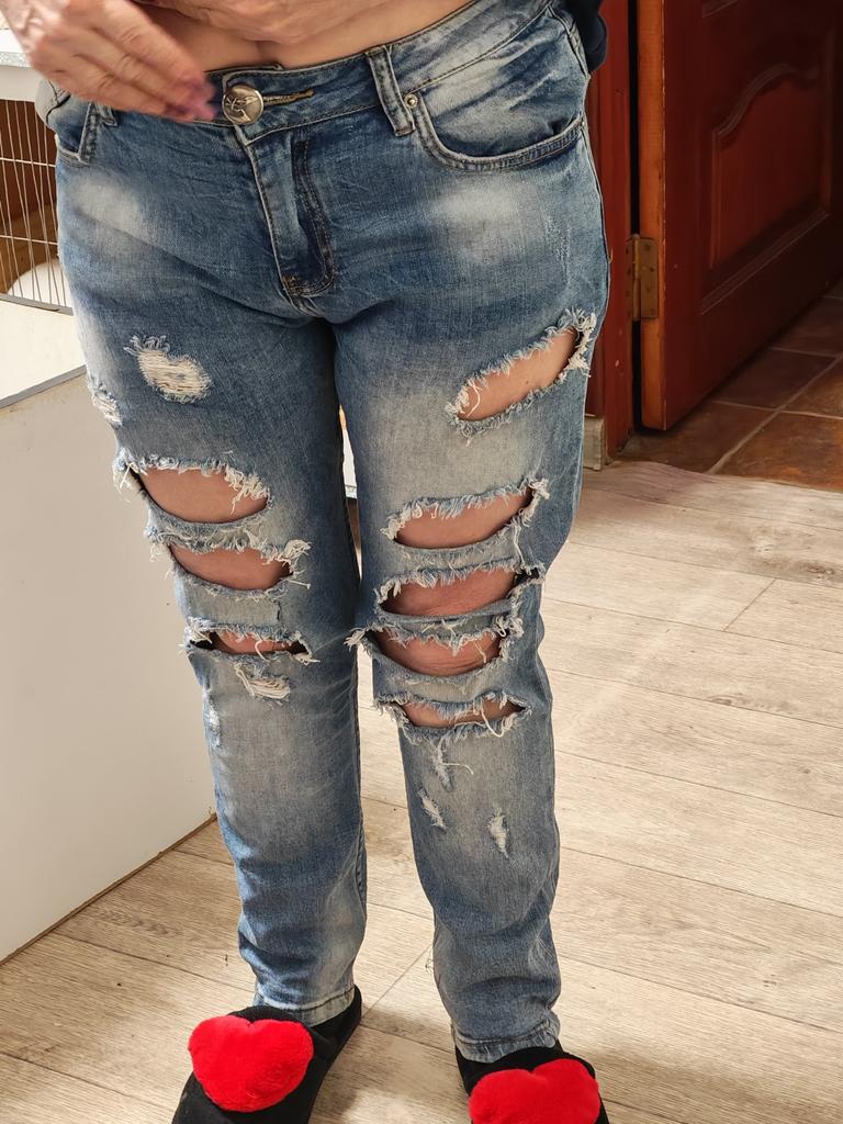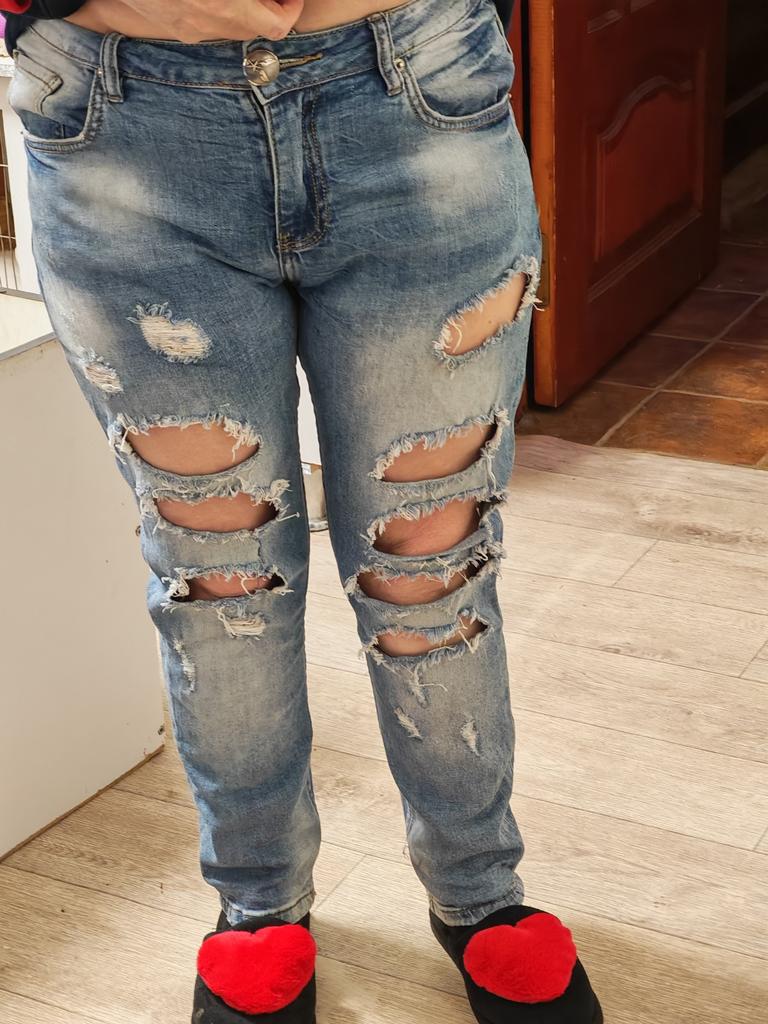 Very strong smell and not like on the model, the wear is different, in some places the folds stick out, they don't stretch on the leg, although the jeans themselves are tight! It looks ugly