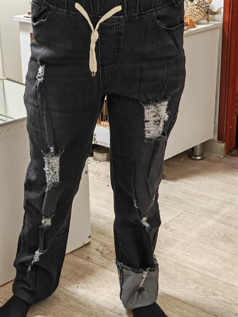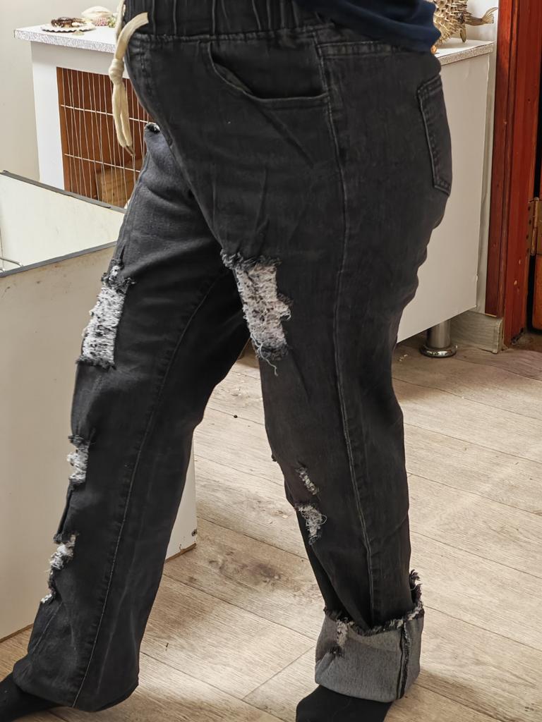 Women's Solid Color Jeans Elastic Waist Drawstring Lace Ripped Plus Size Jeans