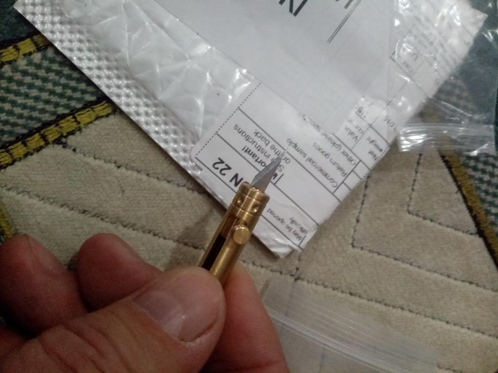 The knife is tiny, with a really microscopic blade. But I need one for opening boxes. The blade is on a spring. Pulls out with a lever and locks by turning to the side.