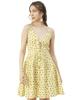 Features: strap shoulders, sleeveless, front tie-up knot, front buttoned, flared hem, V neck, high waist, knee length, lightweight and all over printed pattern
