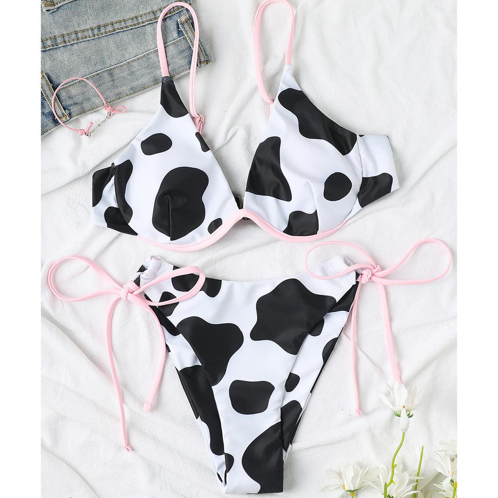 Women's Swimsuit Printed Underwire Side Ties Sexy Low Rise Thong Bikini Beachwear Bathing Suits