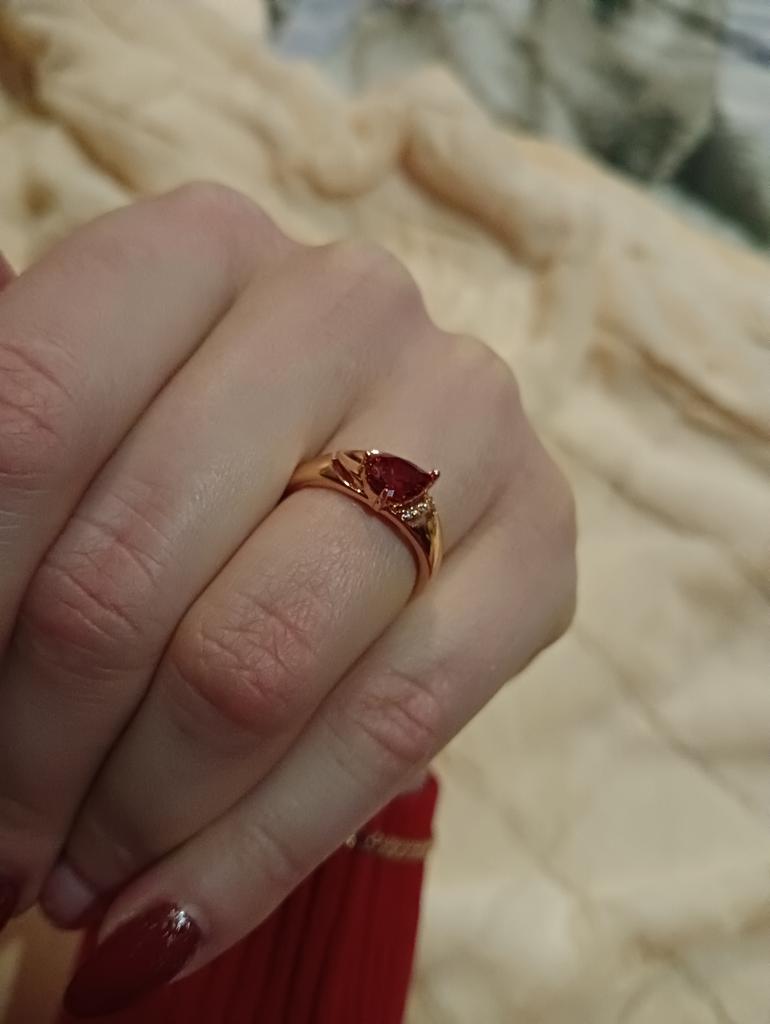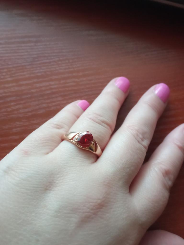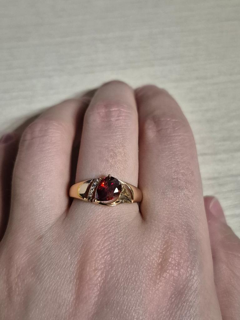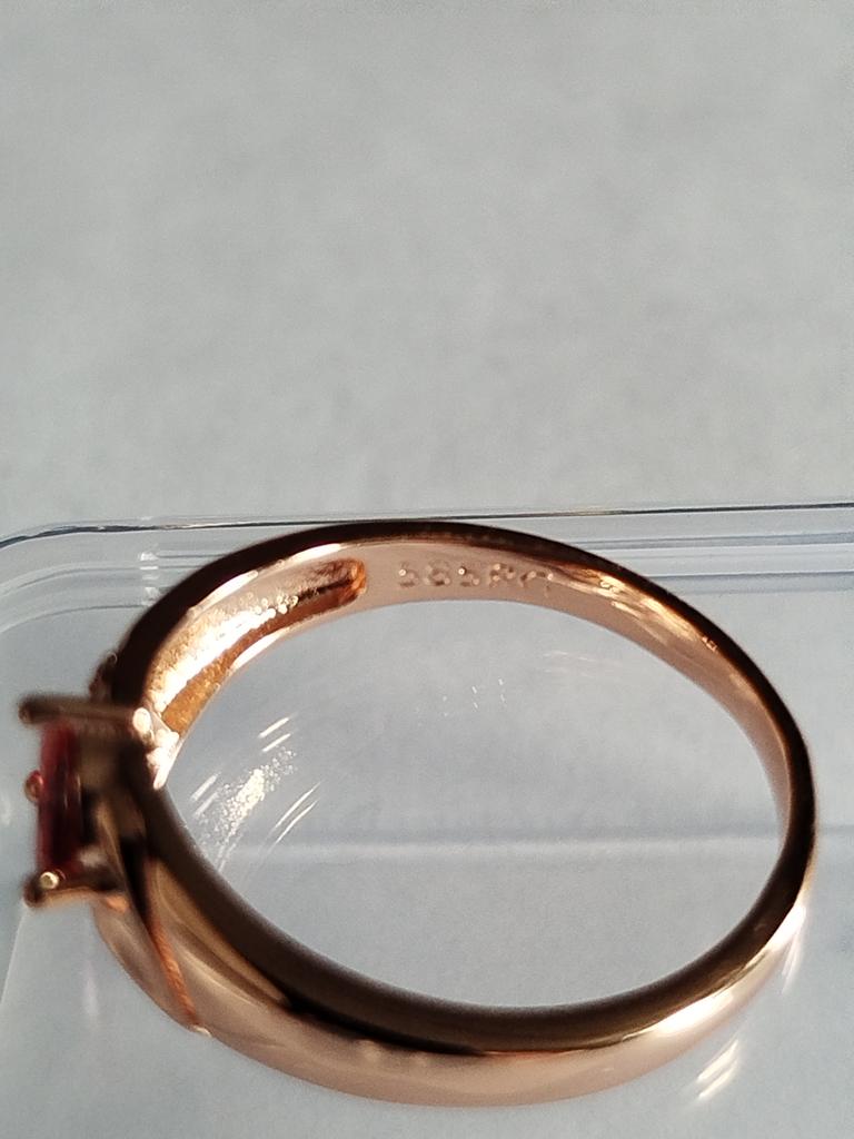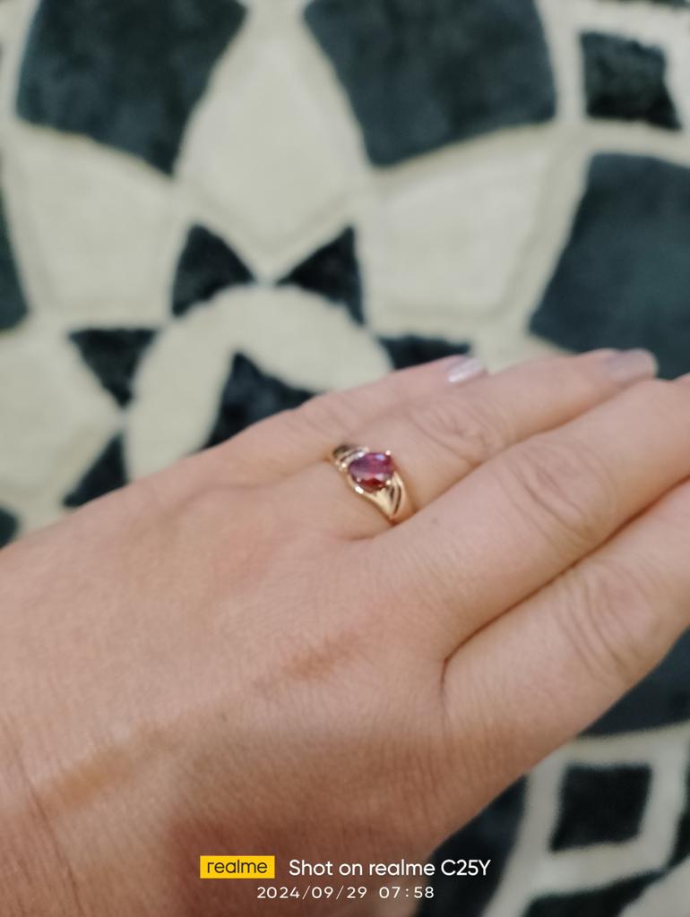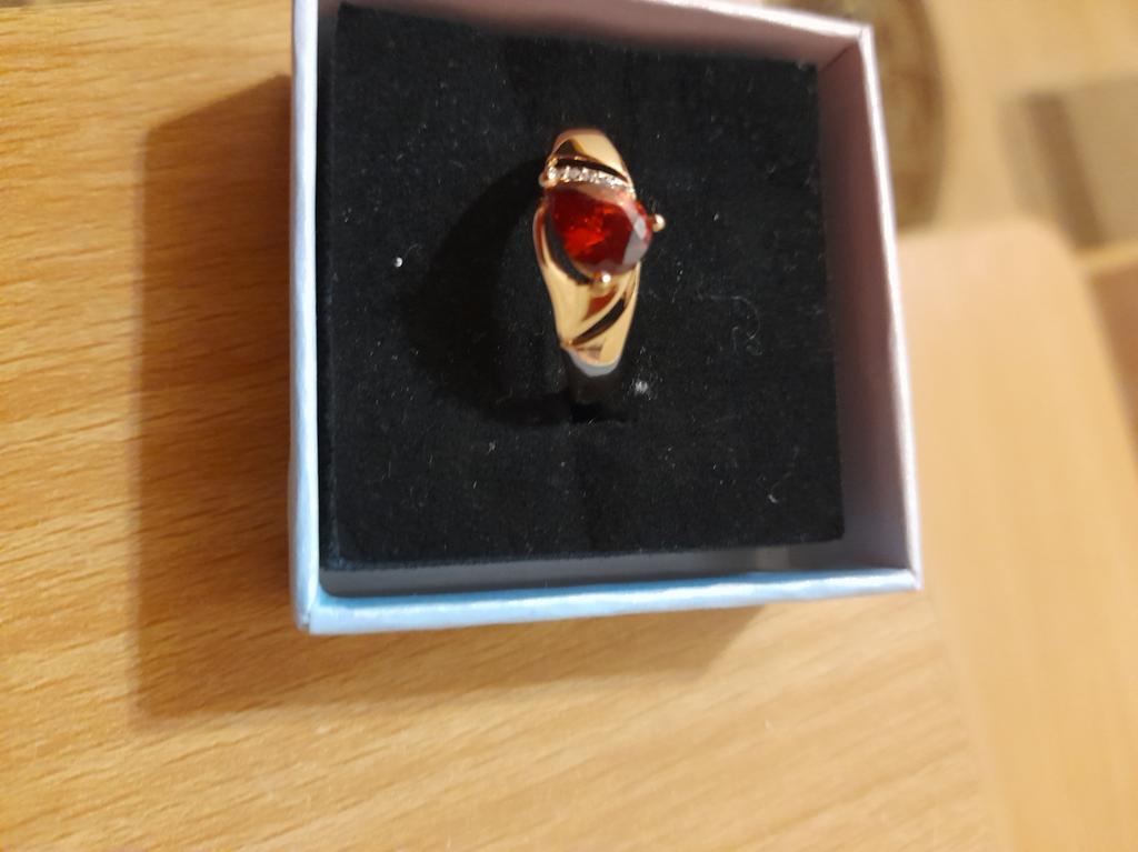 A very beautiful ring, like gold with a ruby. Gorgeous on the finger. I recommend