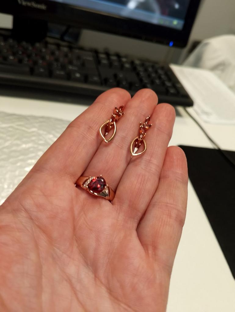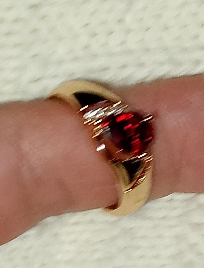 Beautiful ring. Can't tell it from gold. The stone also looks like a garnet.