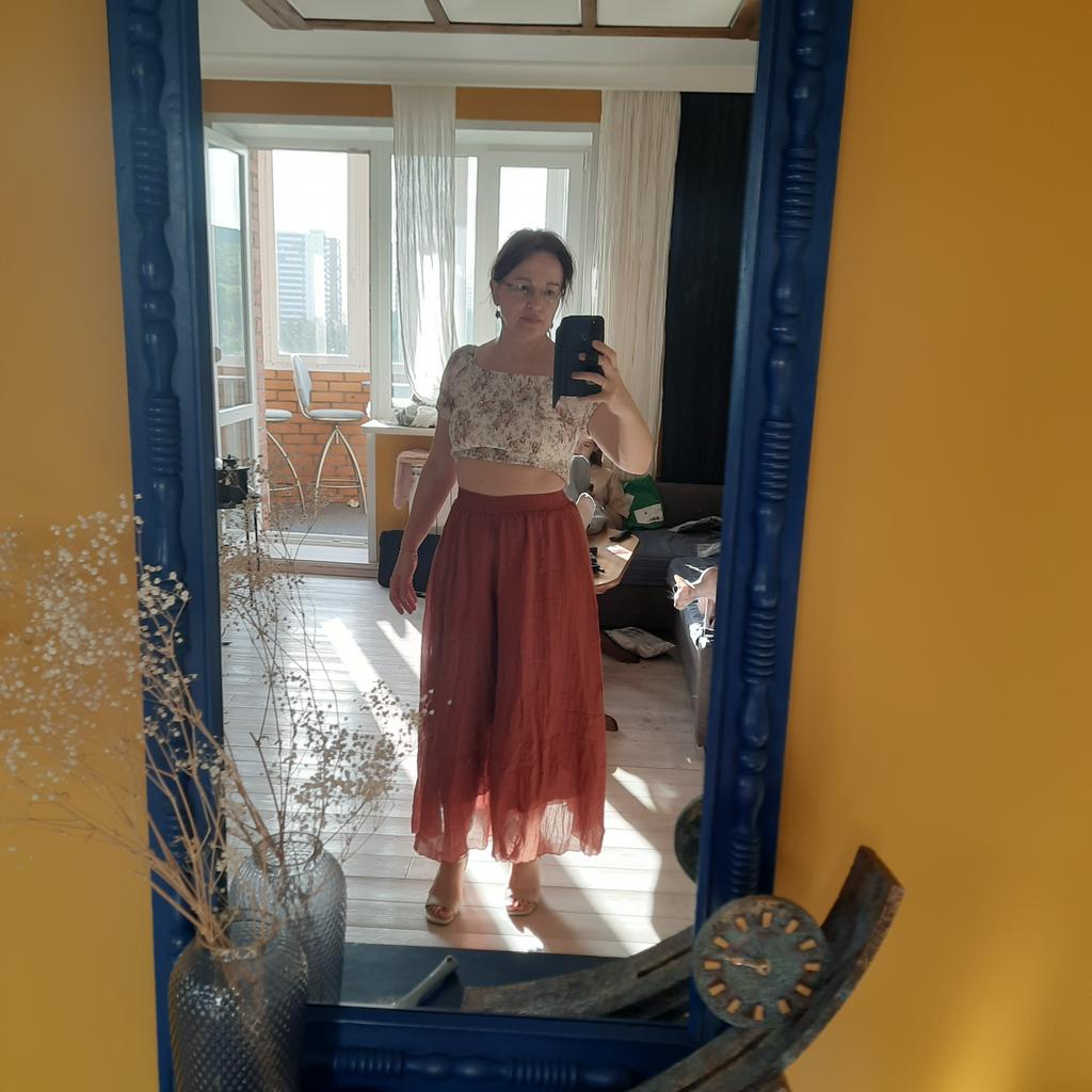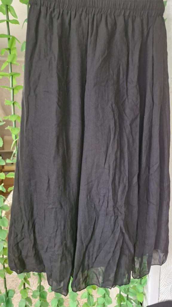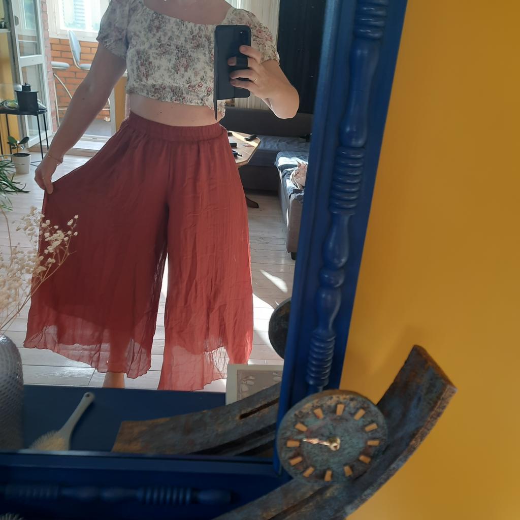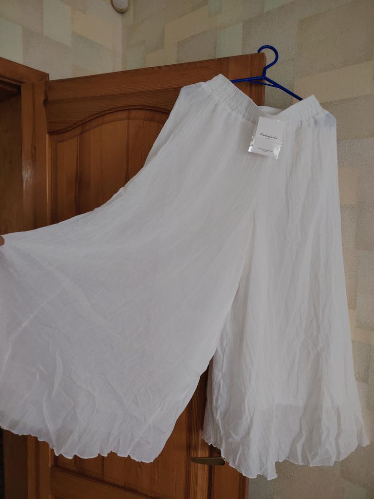 Lovely trousers - a skirt for the summer. The material is similar to cambric, the trousers are not see-through, lined with the same material, without pockets.
