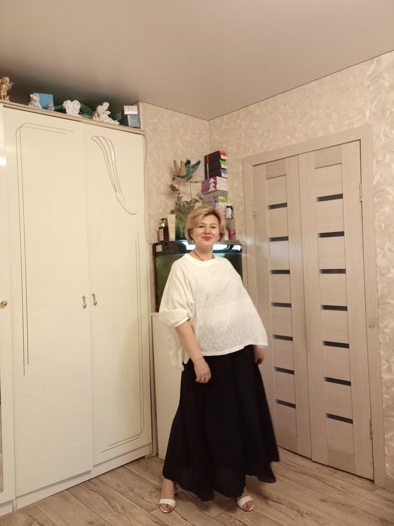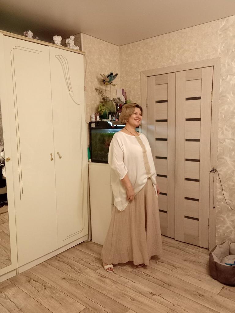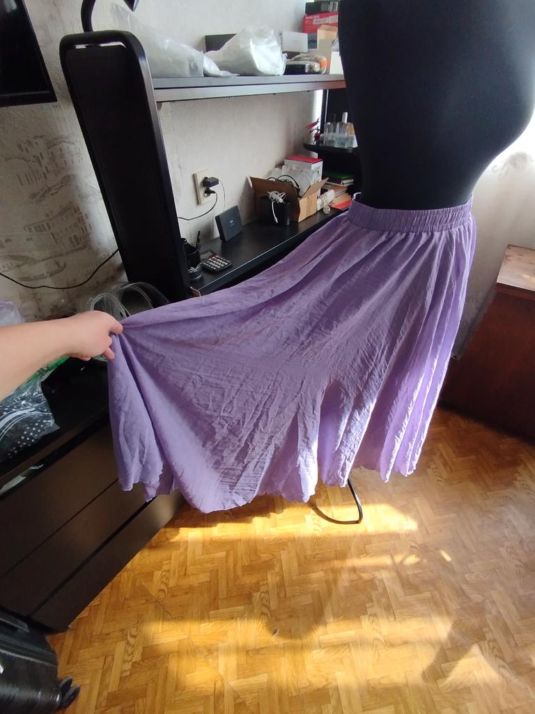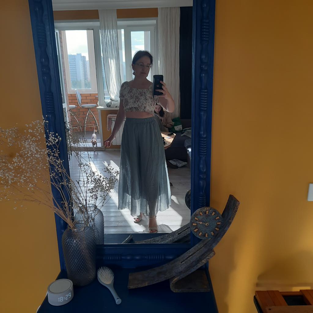 The order arrived in a group parcel. Everything is whole. The size fits, ankle length. Very soft and light material, two layers. The color is yellow, much brighter than in the photo. I'm happy with the purchase.