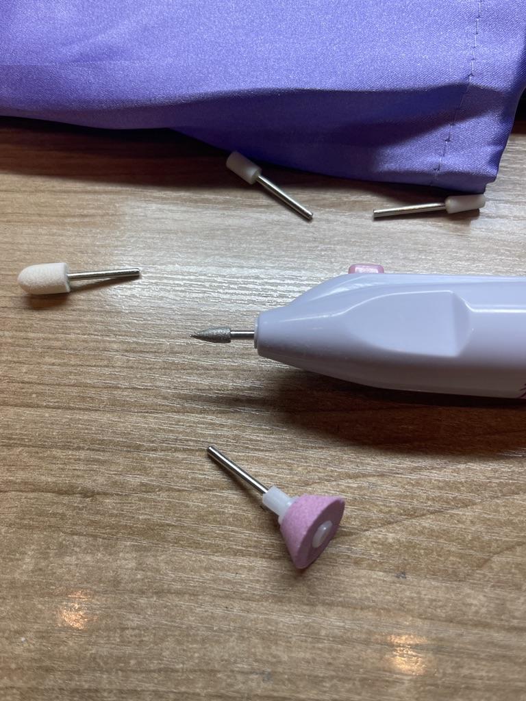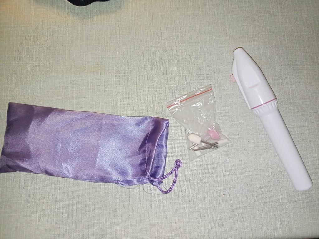 Convenient device for manicure. Powered by two AA batteries. The set contains several attachments. Thank you.
