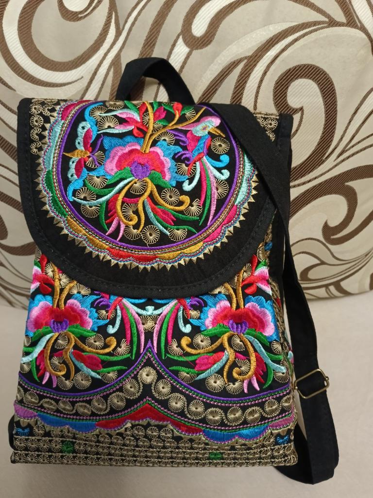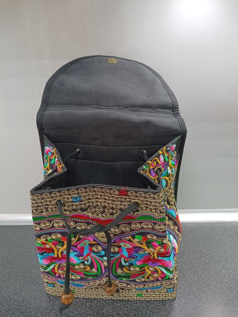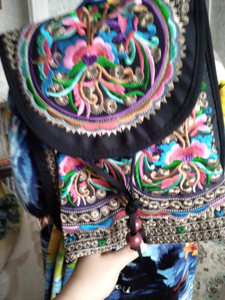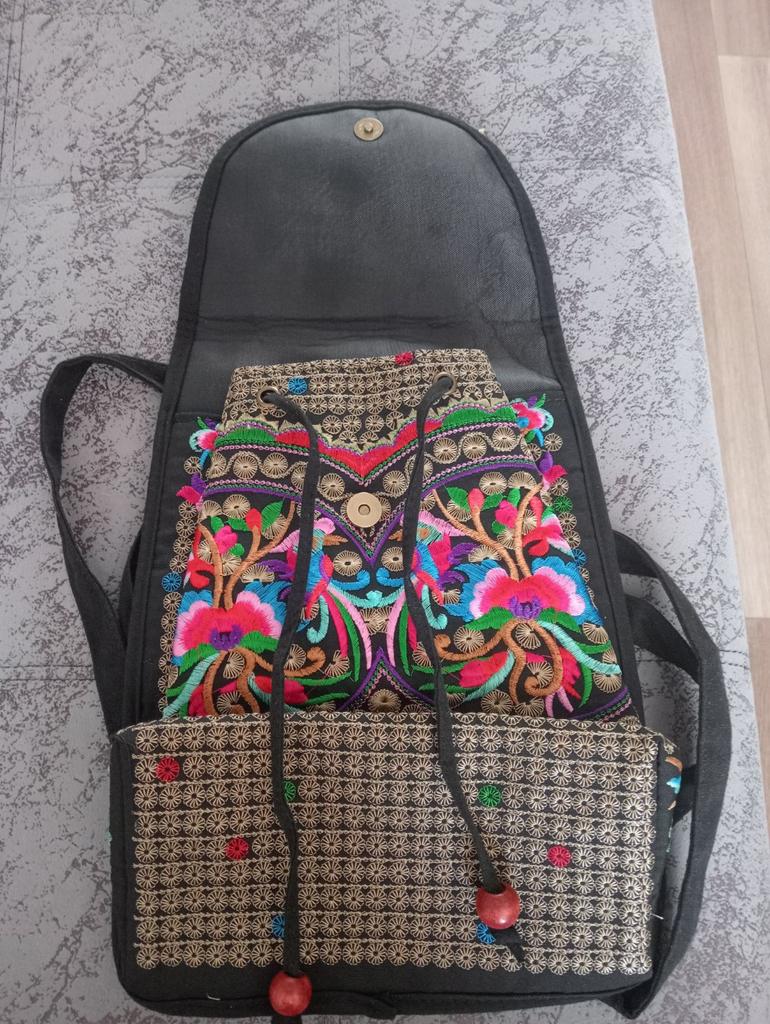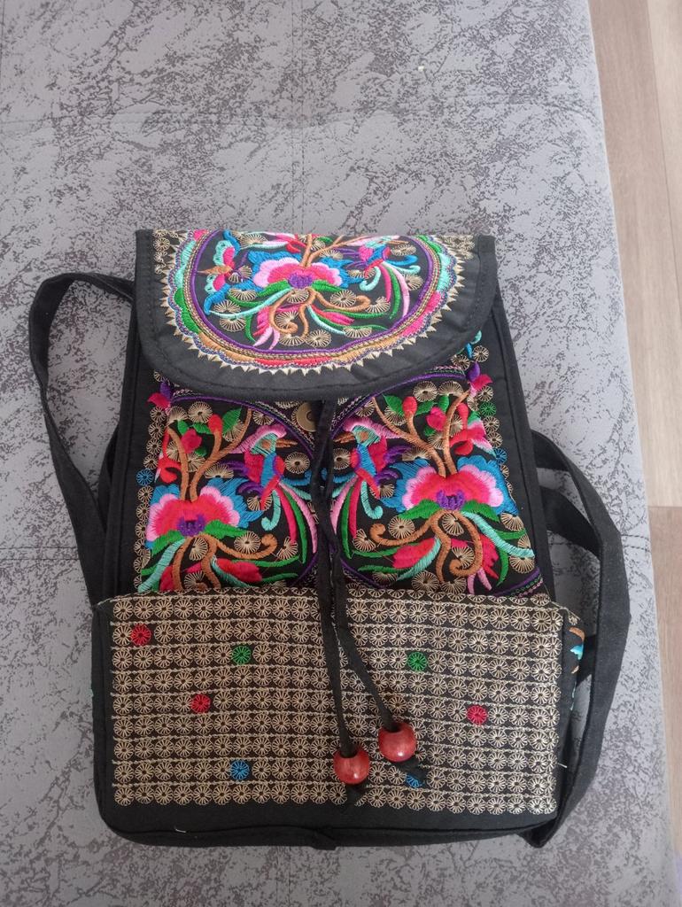 The backpack is very interesting. Beautiful, very neat, bright embroidery. There is one additional pocket inside. Decorative wooden beads on strings. I recommend.