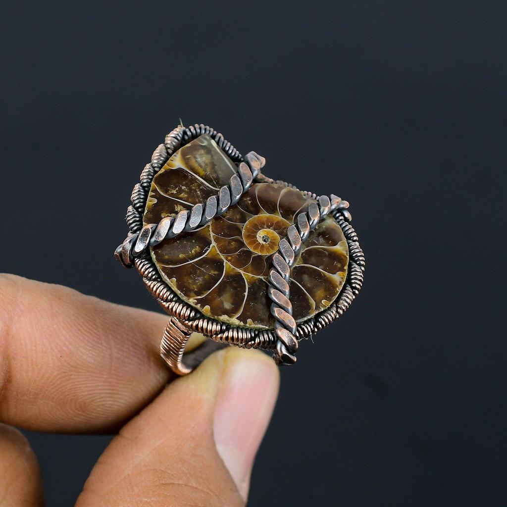 Ammonite Fossil Gemstone Copper Wire Wrapped Handmade Jewelry Ring
