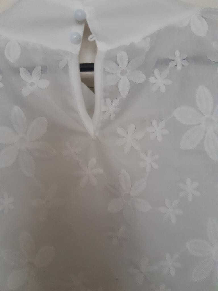 Corresponds to the picture, good quality, two buttons on the collar at the back. In front, under a layer of fabric with embroidery, a thin lining, i.e. not transparent