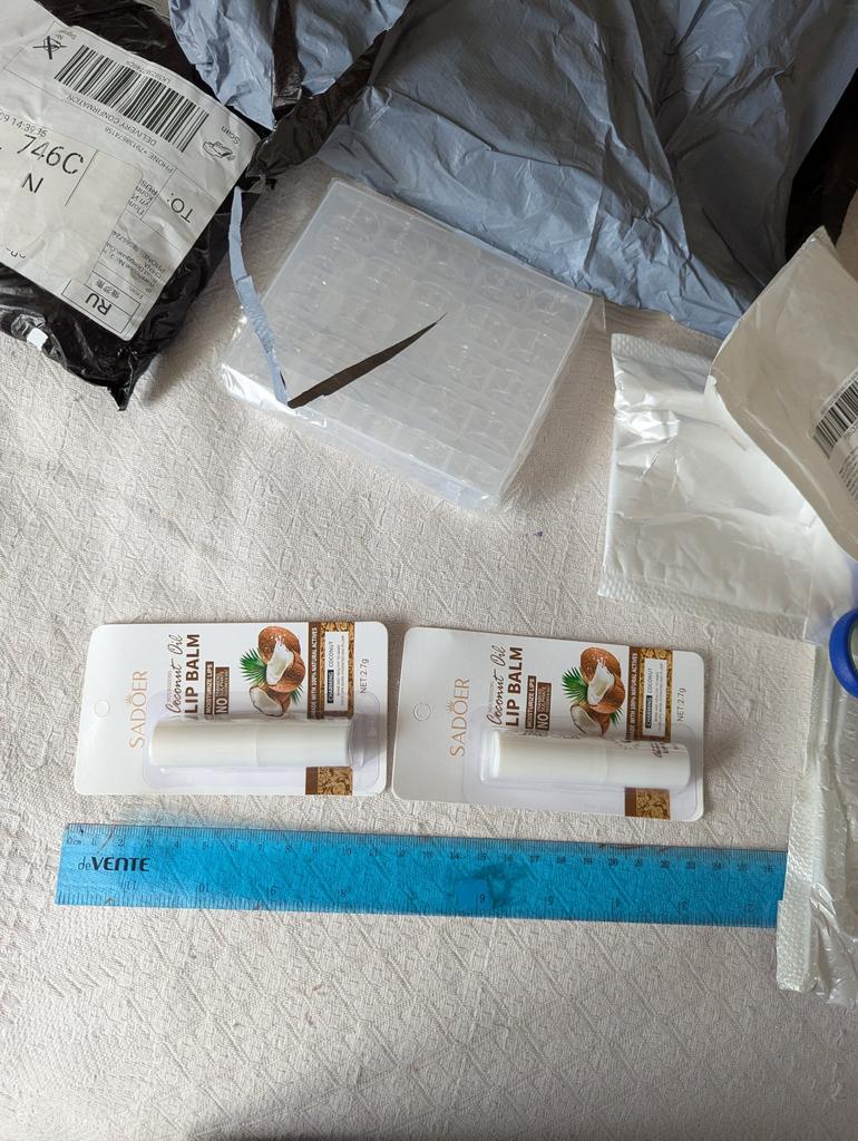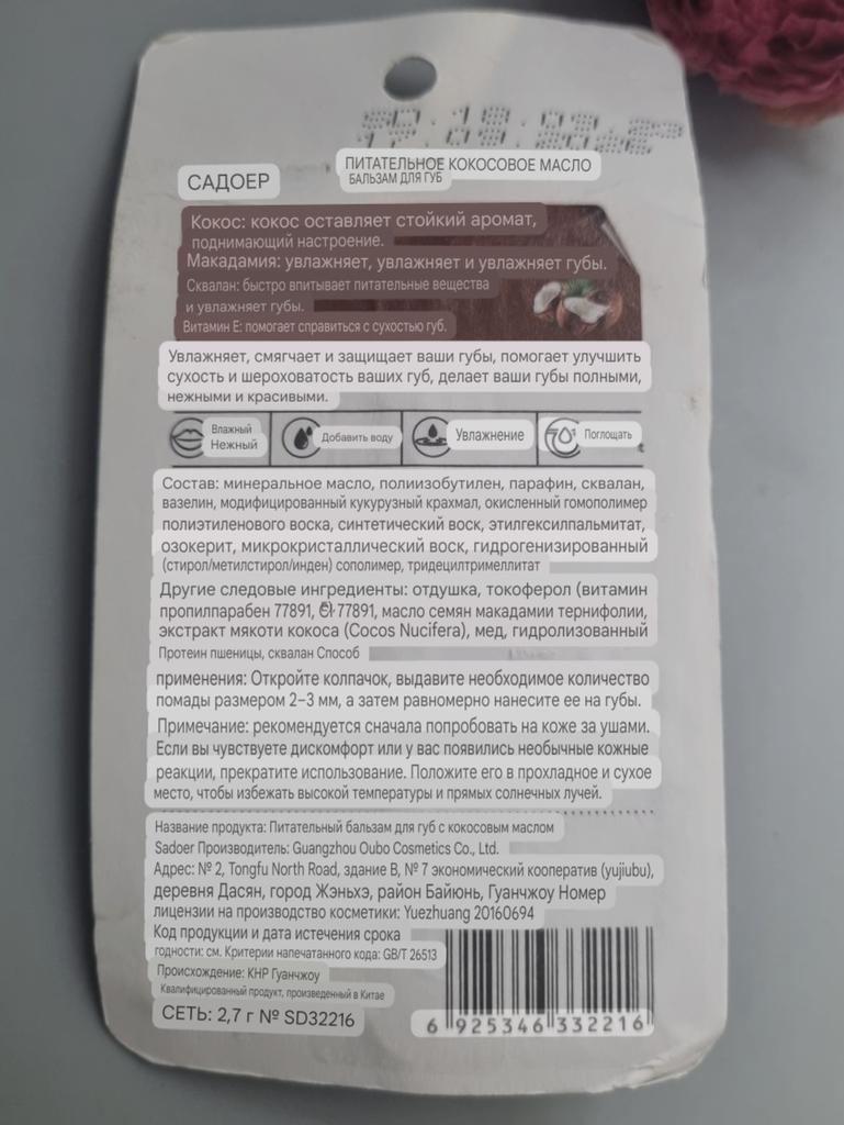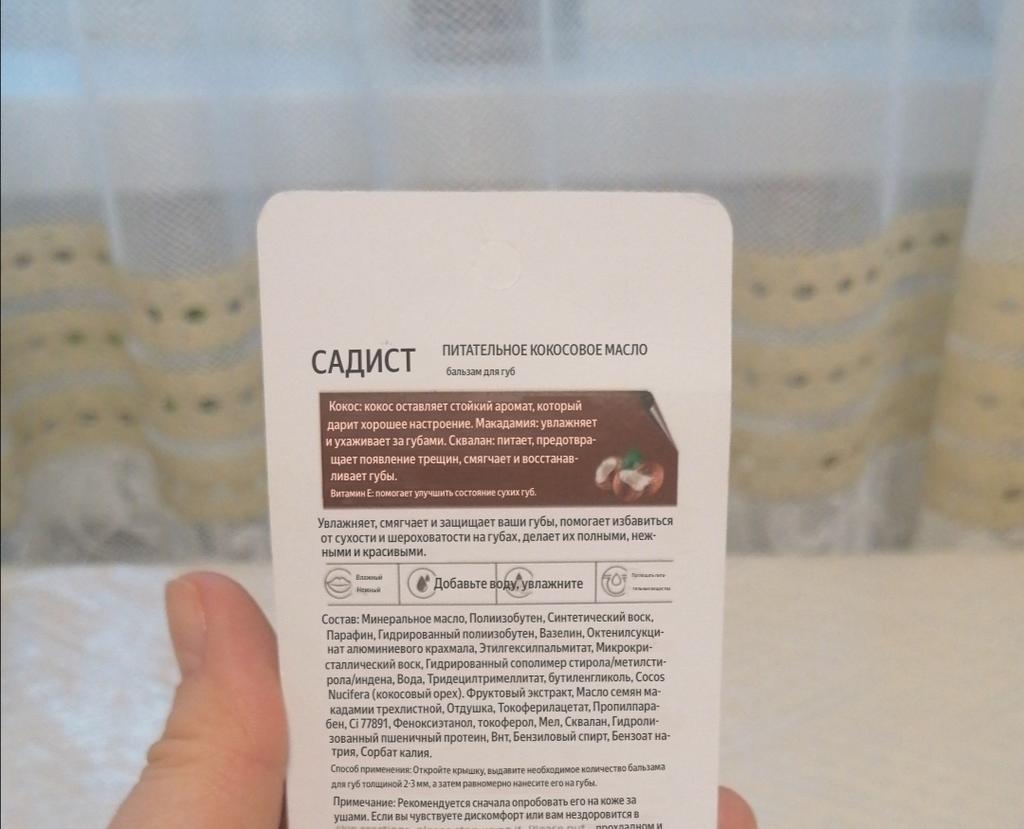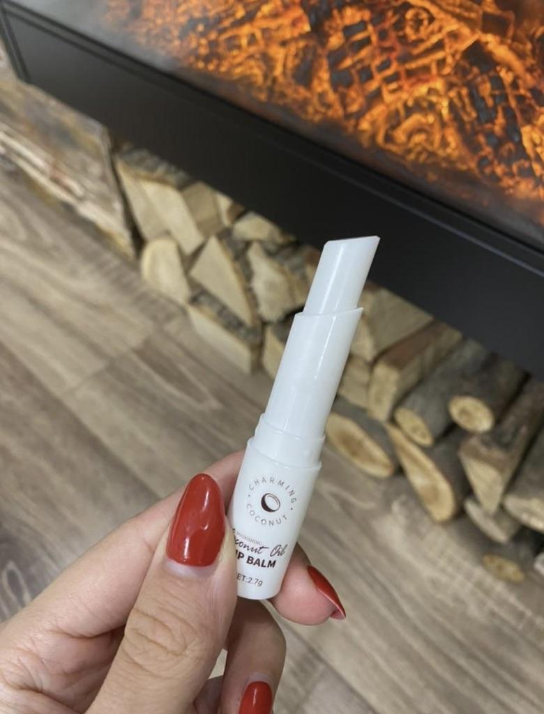 Coconut lip balm. It has a gentle, pleasant aroma of coconut. The texture is greasy. Moisturizes lips very well. Does not leave a feeling of sticky effect. I use it all the time. The seller reliably packed his goods 👌
