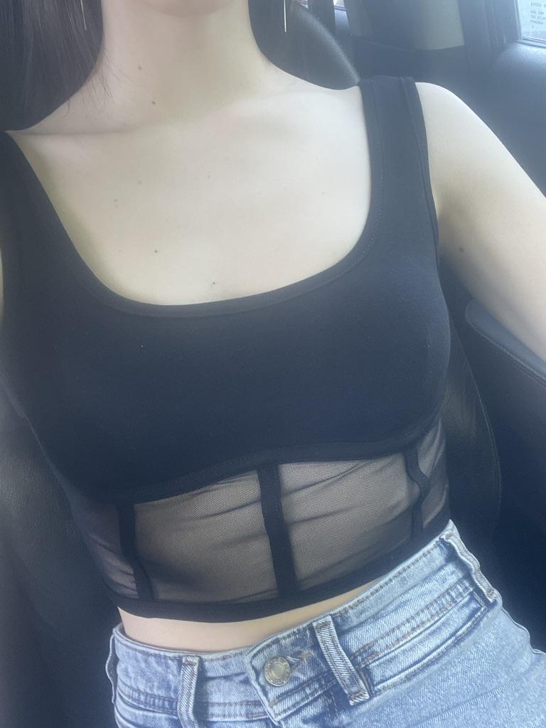 Corset top without corset. Soft top. With mesh at the bottom. There are two layers of fabric on the chest. Doesn't shine through. Sits tight. That's why you can't wear it with a bra. It's too small for me in the armpits. It cannot be worn on a chest under 90.