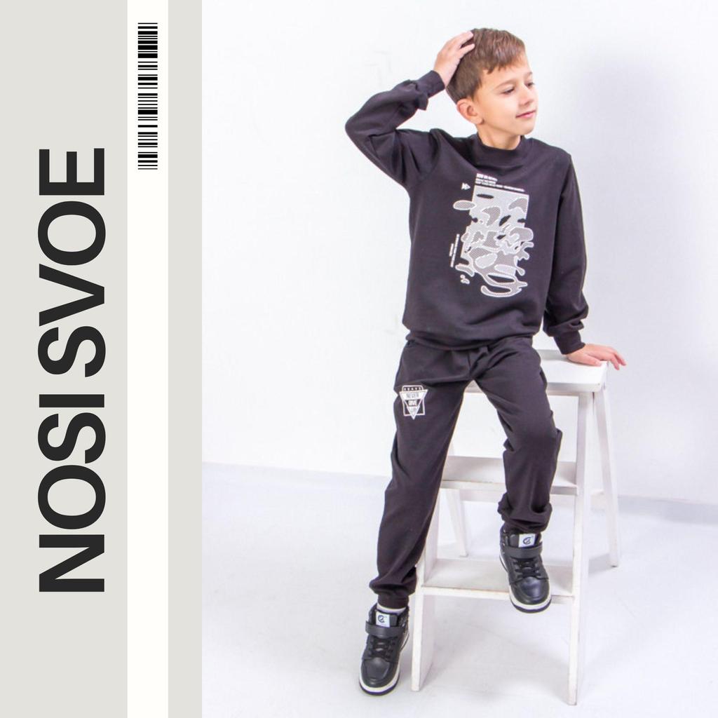 The boys' sports suit is made from high-quality double-thread fabric. The set includes a stylish hoodie with a hood and comfortable pants. The hoodie features a hood and wide elastic cuffs on the sleeves and bottom. The pants have a comfortable waistband and two side pockets. Both the hoodie and pants are adorned with a modern printed design. This suit is perfect for everyday wear, sports activities, or active outings. The high-quality material ensures durability, and with proper care, the suit can be worn for several seasons. It may shrink slightly after washing.