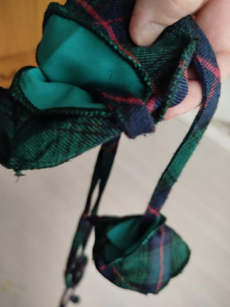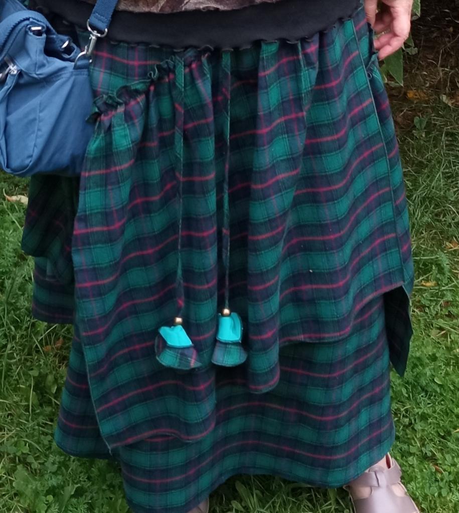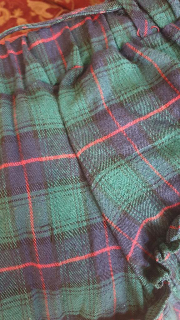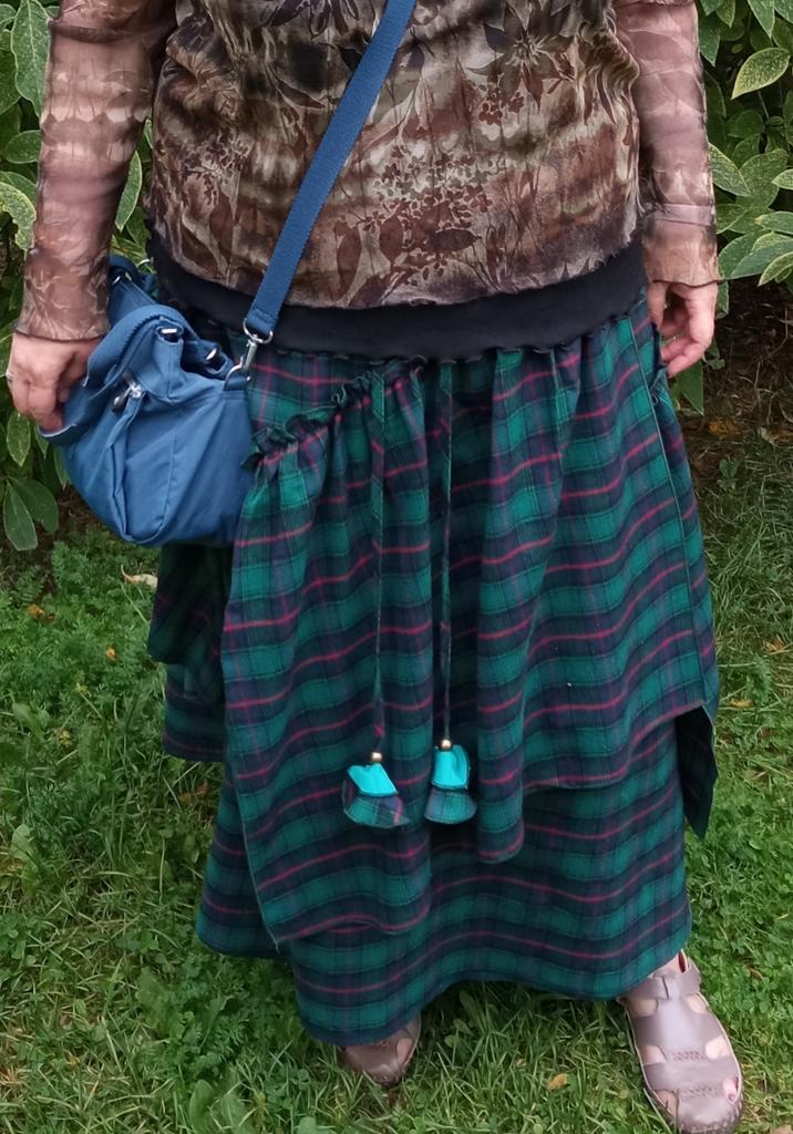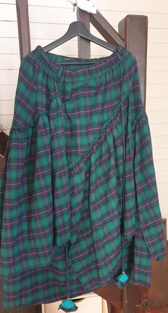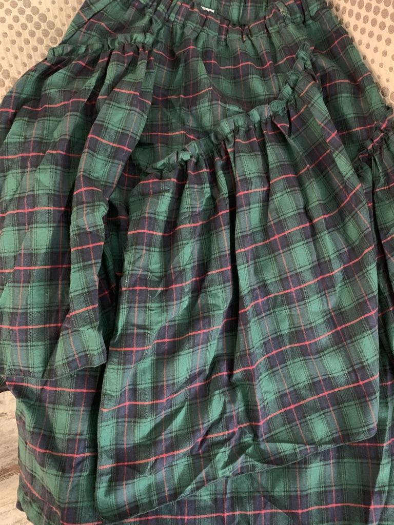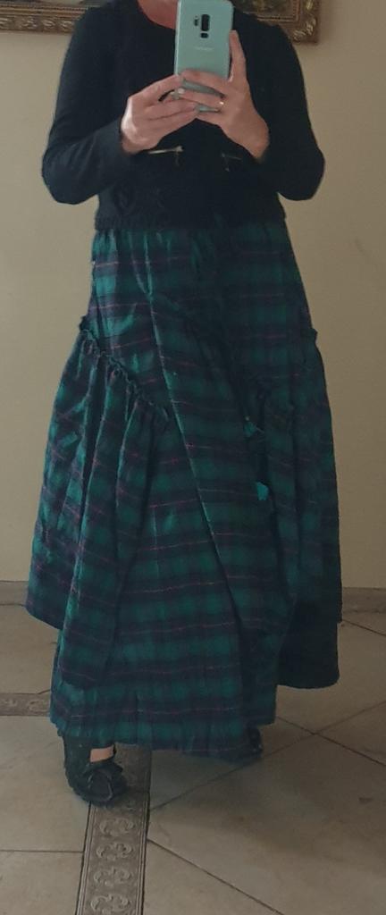 Gorgeous skirt, a bit big but it has an elastic waistband and a belt. The color and style all match. The fabric is similar to flannel, soft, the color is saturated. All excellent