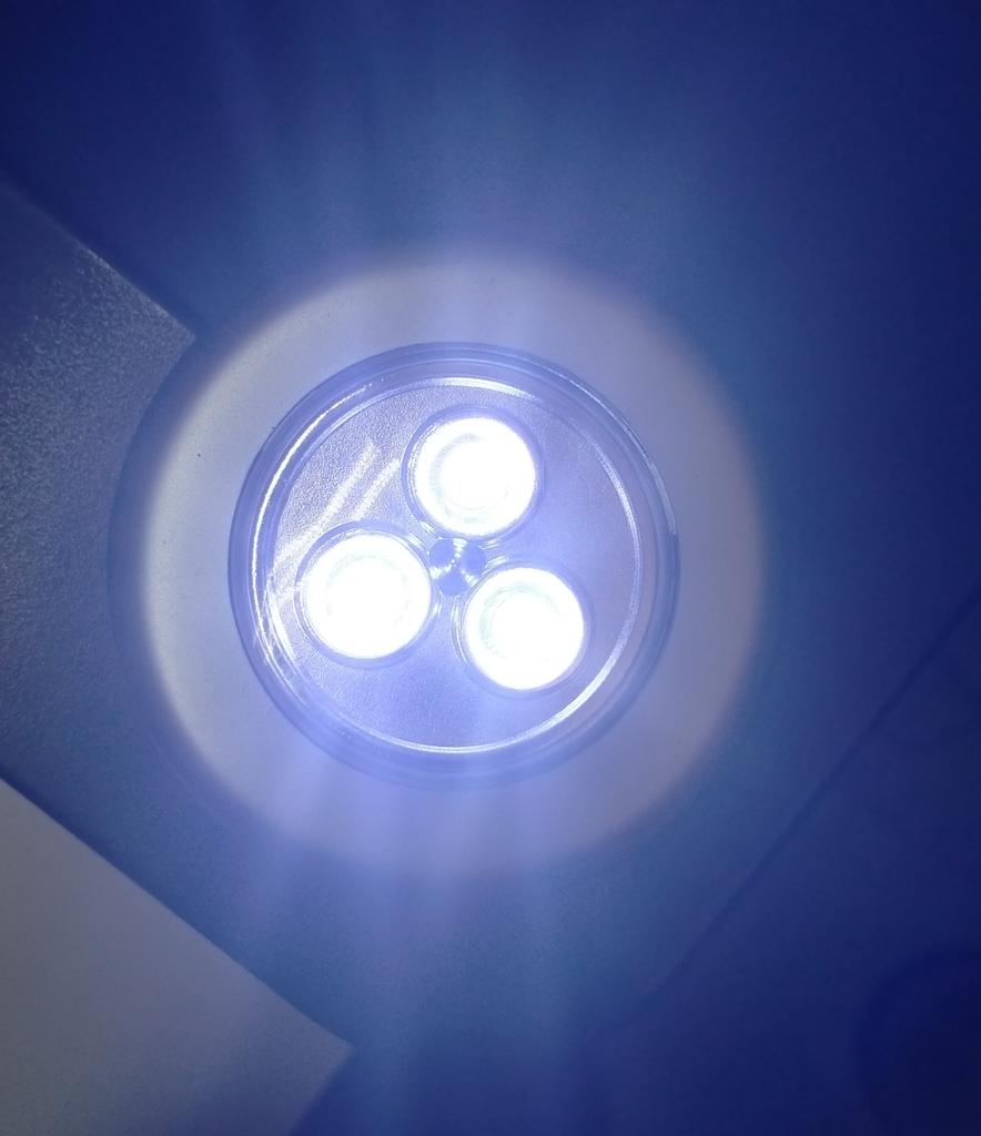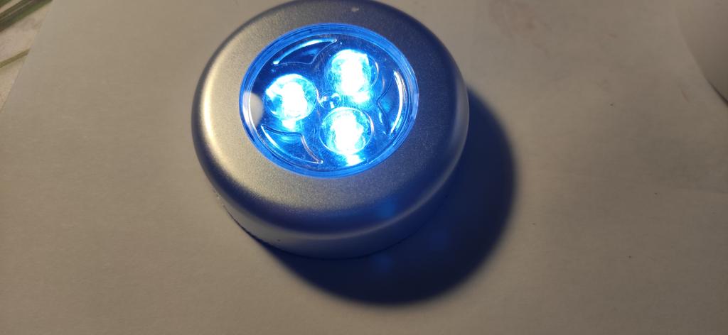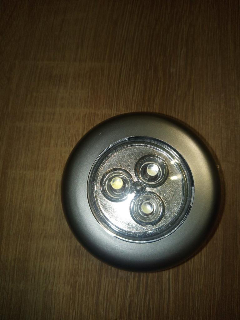 I put AAA batteries in it, stuck it on the iron door - it shines brightly. It's quite suitable for a storage room, local lighting. I just thought that there was a motion sensor, but no, it turns on manually by pressing it.