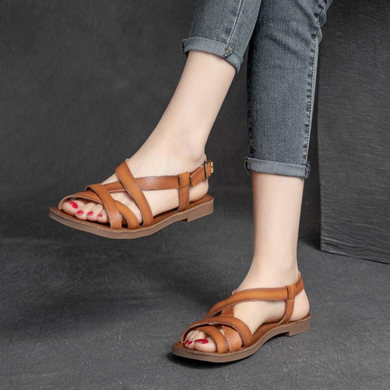 Johnature Simple Genuine Leather Flat Sandals Casual Solid Color Soft Sole Comfortable Versatile Women Shoes