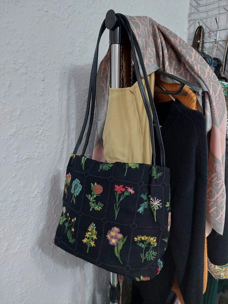 I only gave 4 stars because the handbag is too small and made of thick satin, I thought it would be made of corduroy. Bottom, handles are made of black dermantine, one handle is longer than the other. One internal pocket. Button closure. The embroidery is pleasing: neat and bright, appropriate for summer .