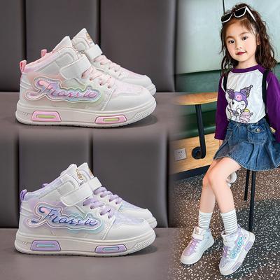 Girls' Sneakers Leather Spring and Autumn All-match Children's Mid-top Casual Soft-soled Running Shoes