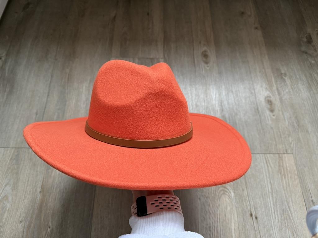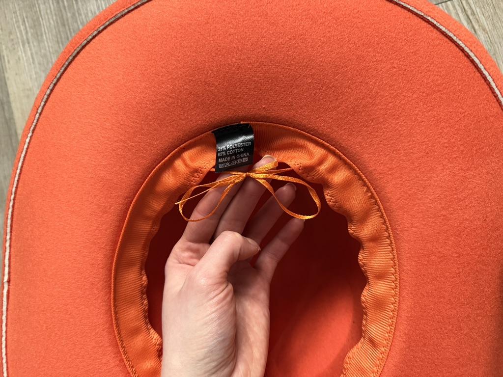 The hat is amazing. It looks very high quality. The color is rich, reddish-orange, there is a ribbon inside for adjusting the width. Composition 65% cotton, 35% polyester on the tag
