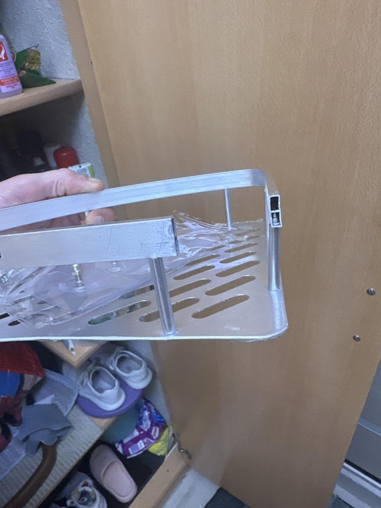The shelf is clumsy, aluminum. Made very poorly and even bent along the way. Its only plus is that it will not rust in the bathroom. Two types of fasteners - on dowels and on stickers. Looks cheap. I don't recommend it.