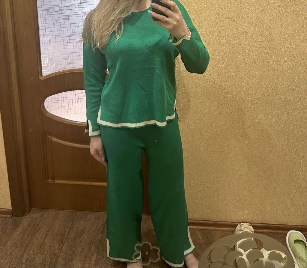 The suit is made of knitwear. The quality is ok. The pants fit size 36-38. The blouse also comes in size 50. So the size of the pants and the size of the blouse do not correspond at all.
