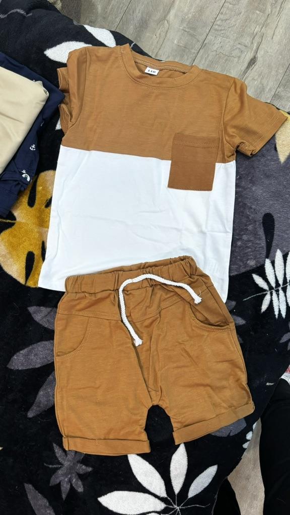 Toddler Boys Summer Outfit Sets Short Sleeve Contrast Color Tops + Solid Color Drawstring Shorts