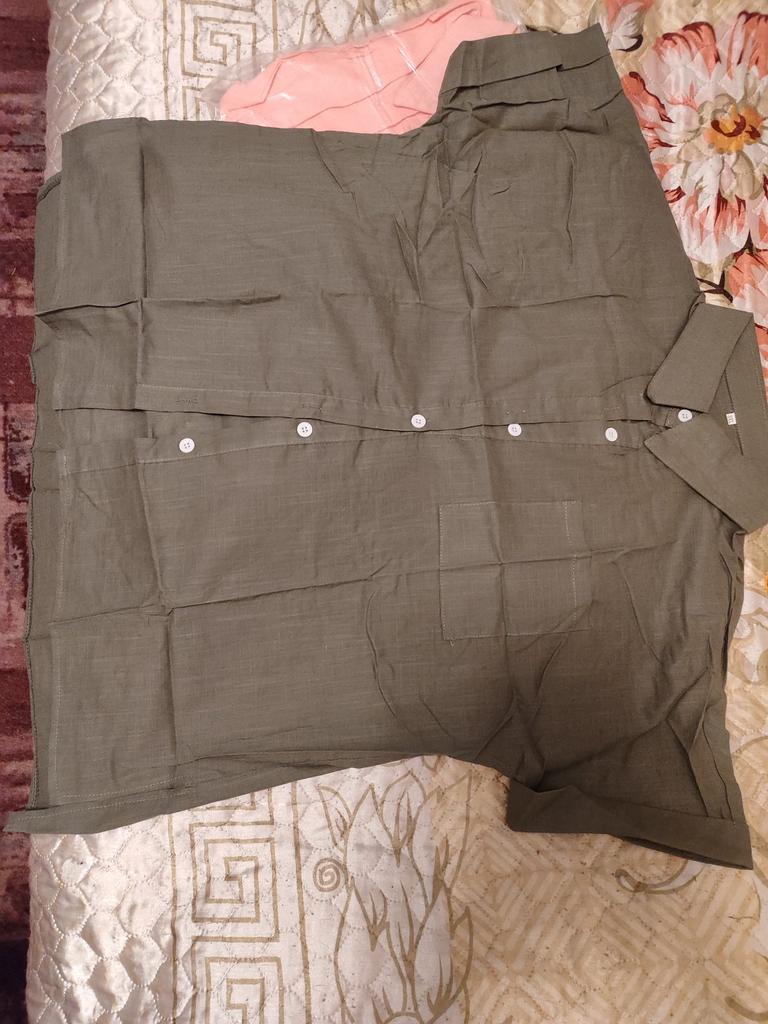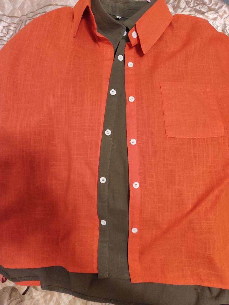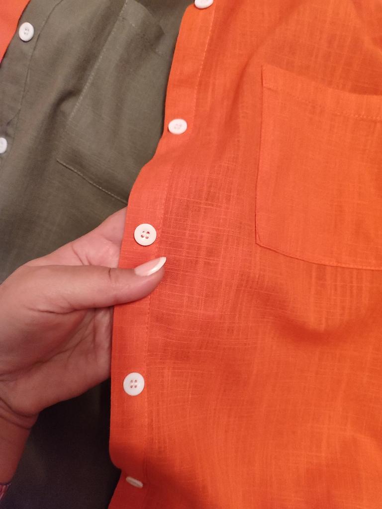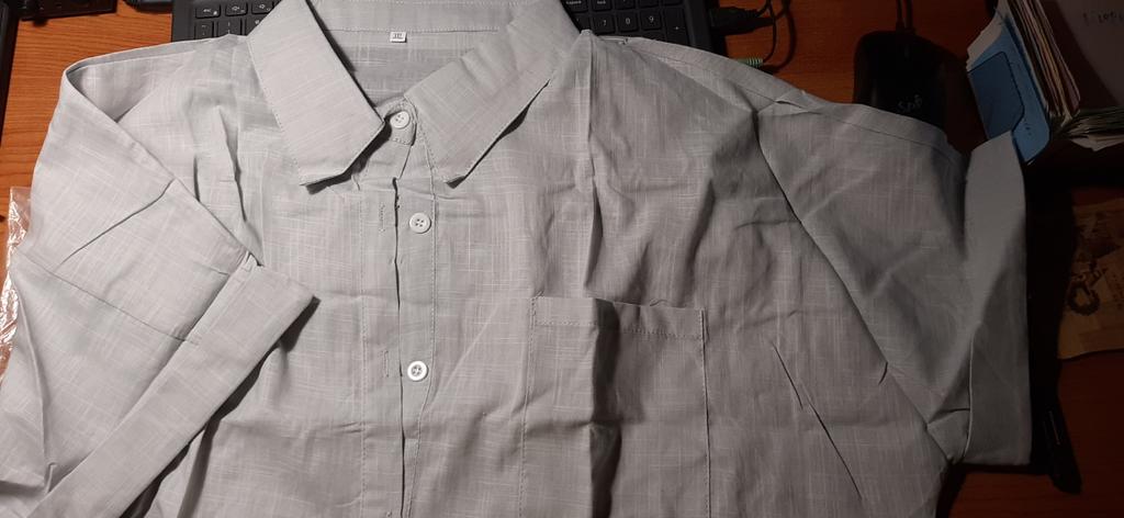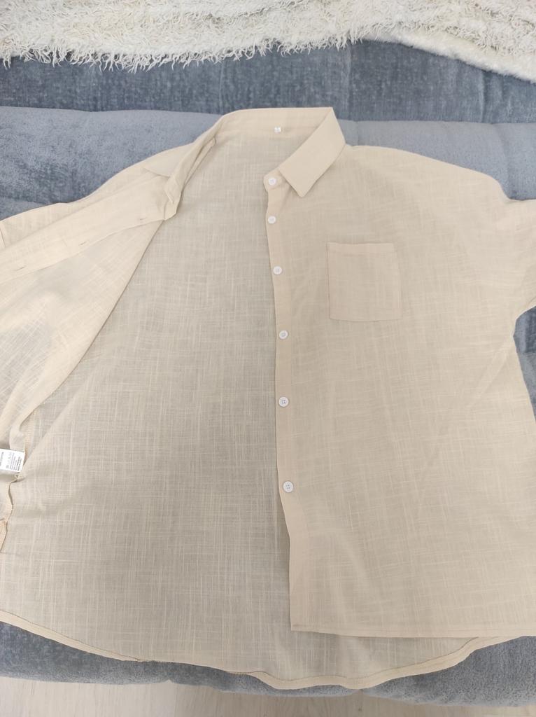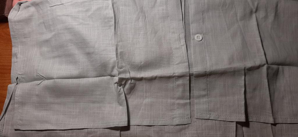The shirt is wonderful. The only drawback is that the khaki shirt has white buttons sewn on it. I replaced it with coconut ones. 3xl fits 50-52, bust size 102. Loose fit. Moderately free. I washed it on the general cycle, temperature 30 degrees. The fabric became softer and did not shrink.