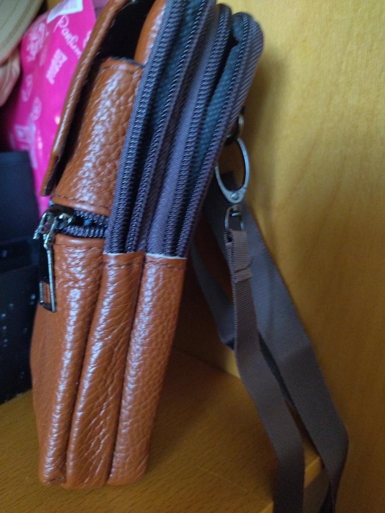Real leather Nicely finished with enough room for Mobile phone, wallet, papers etc Magnetic catch I would easily recommend this product. It will last for years & will always look better with age. Dark brown looks classic....
