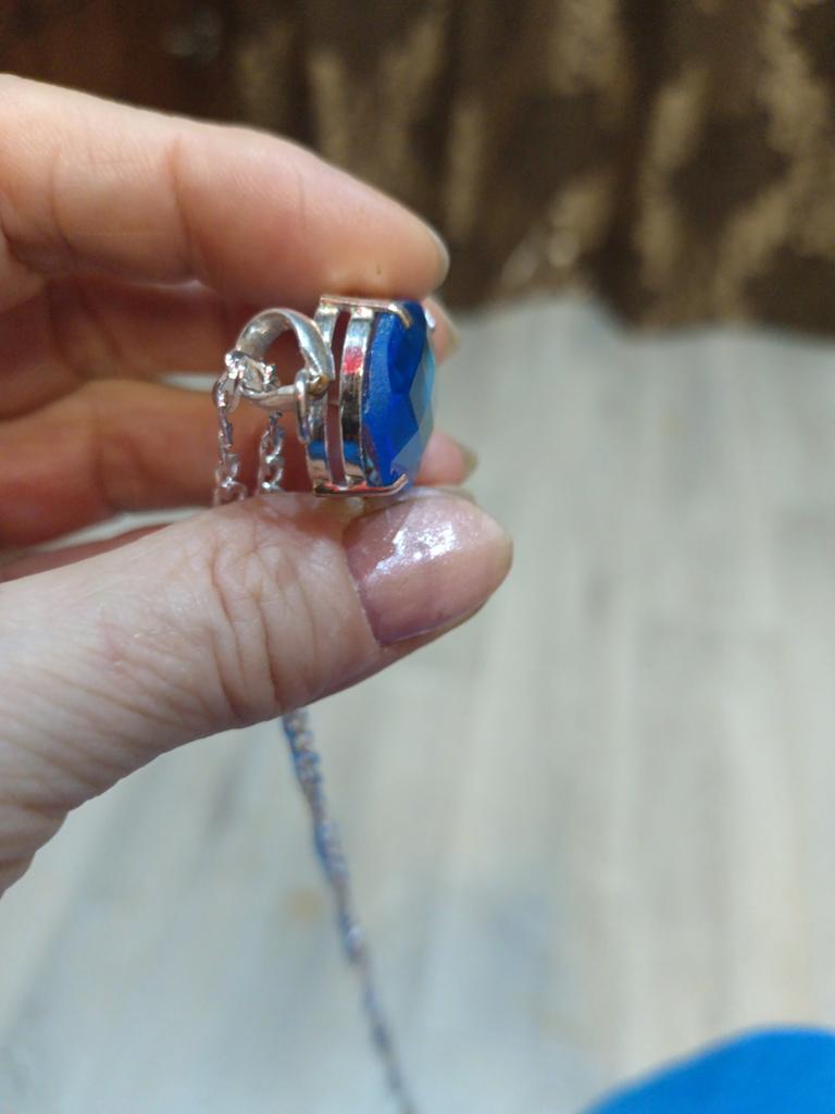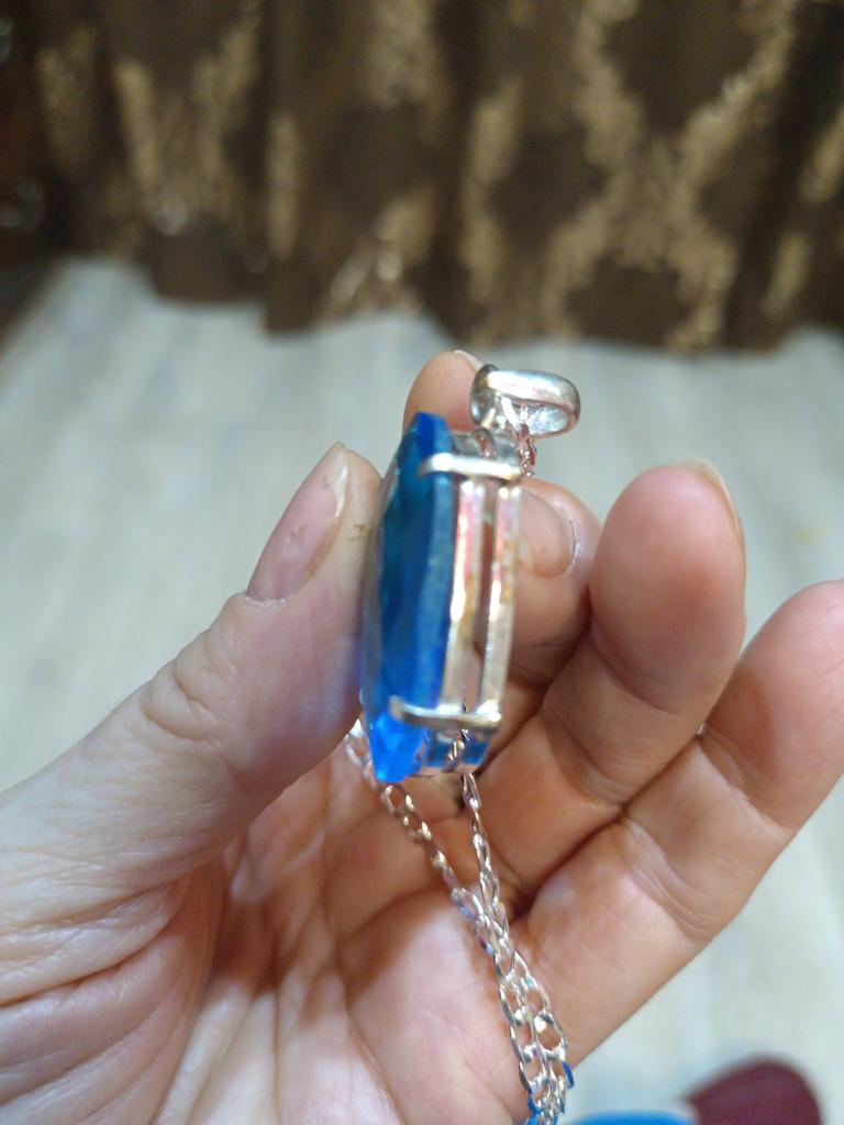 Silver pendant (without chain) with a large blue topaz. The silver hallmark is present. The side parts of the stone are not polished well, rough to the touch. This is visually noticeable. The stone protrudes beyond the upper and lower parts of the pendant. A little disappointed. The size of the stone, 3.2 cm × 2.8 cm, was pleasing.. For the first time, a product from India arrived not quite of good quality.