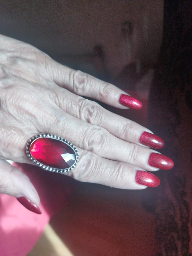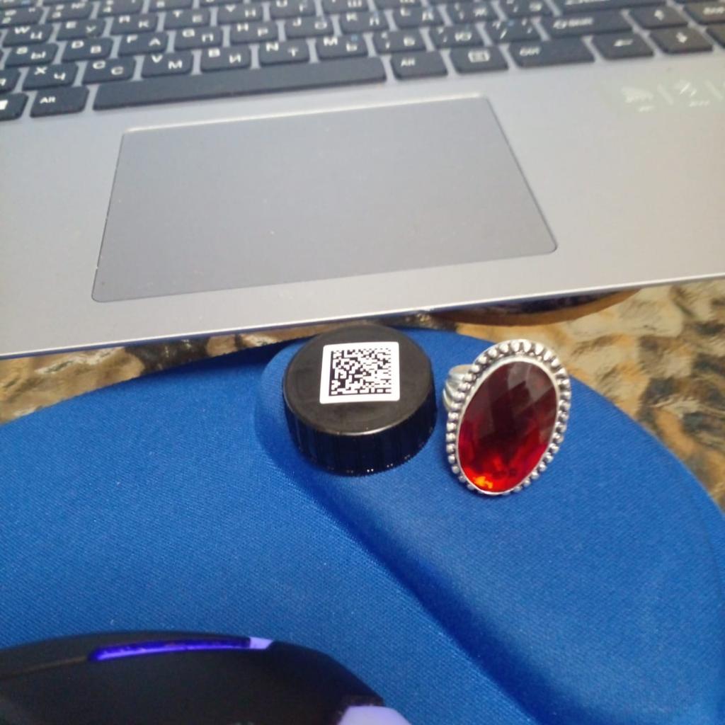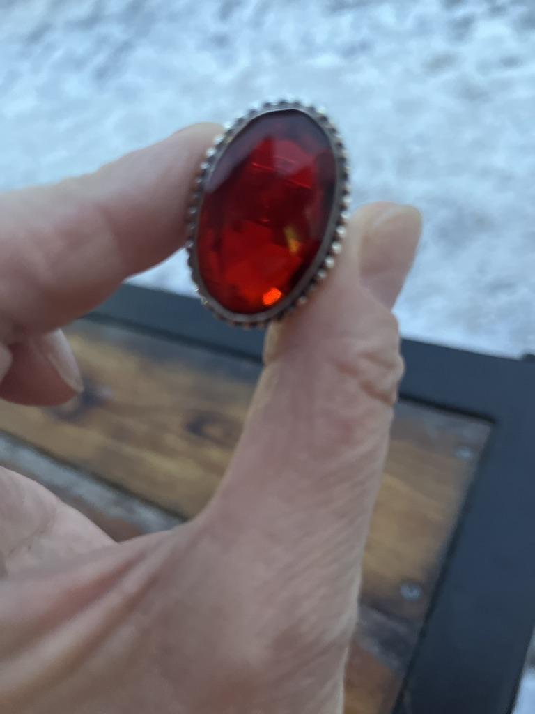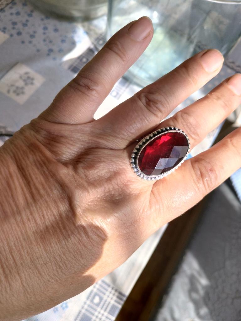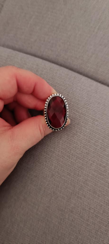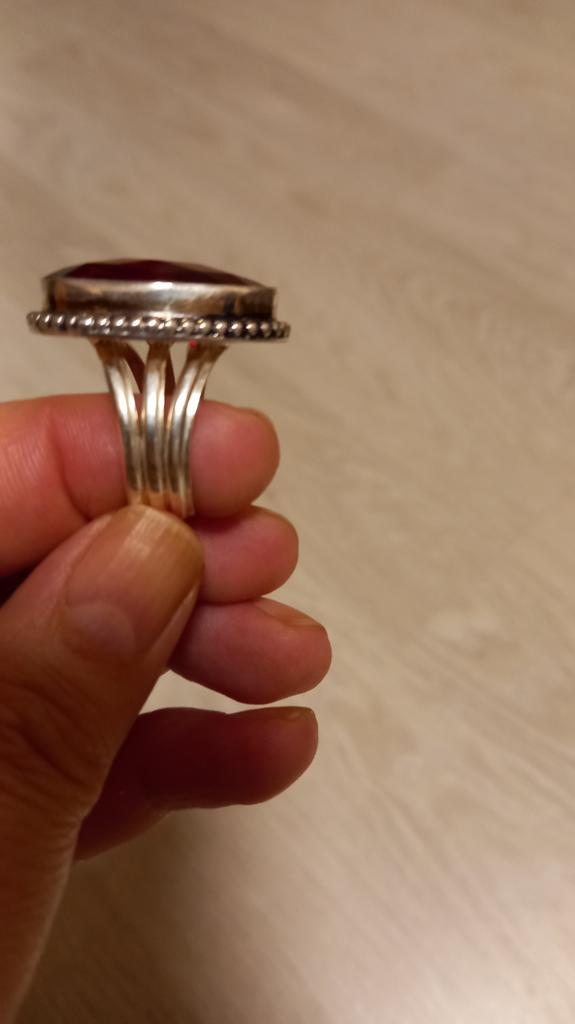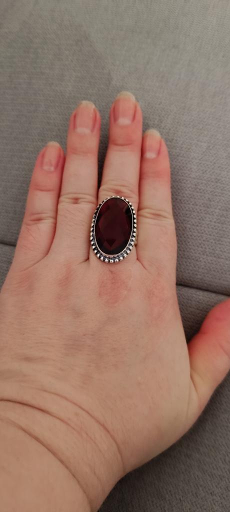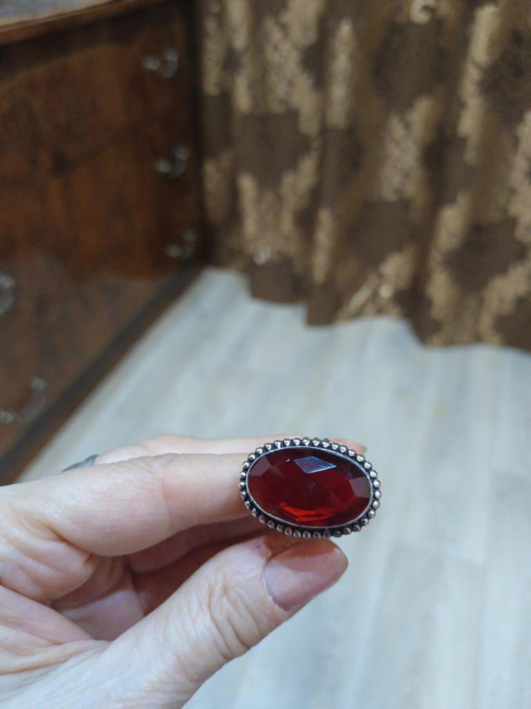 The stone is lighter than in the photo, in the photo it is black and red, but in reality it is red, I think it is not a garnet, there is no metallic glow, like in a garnet. But otherwise it is a beautiful ring