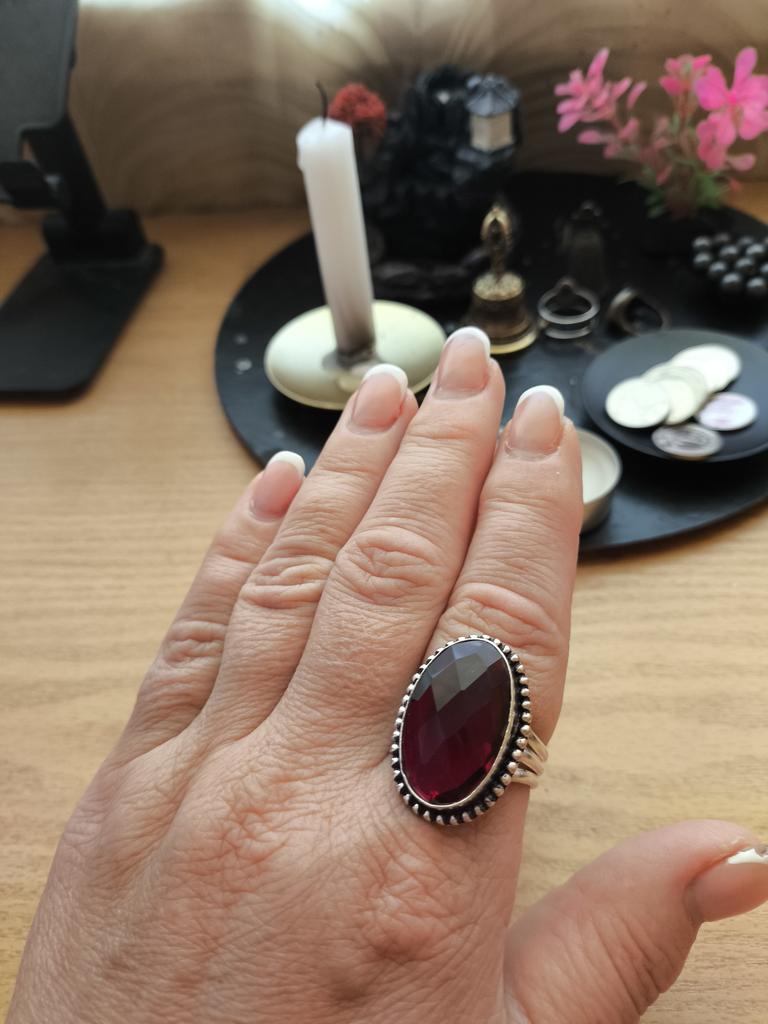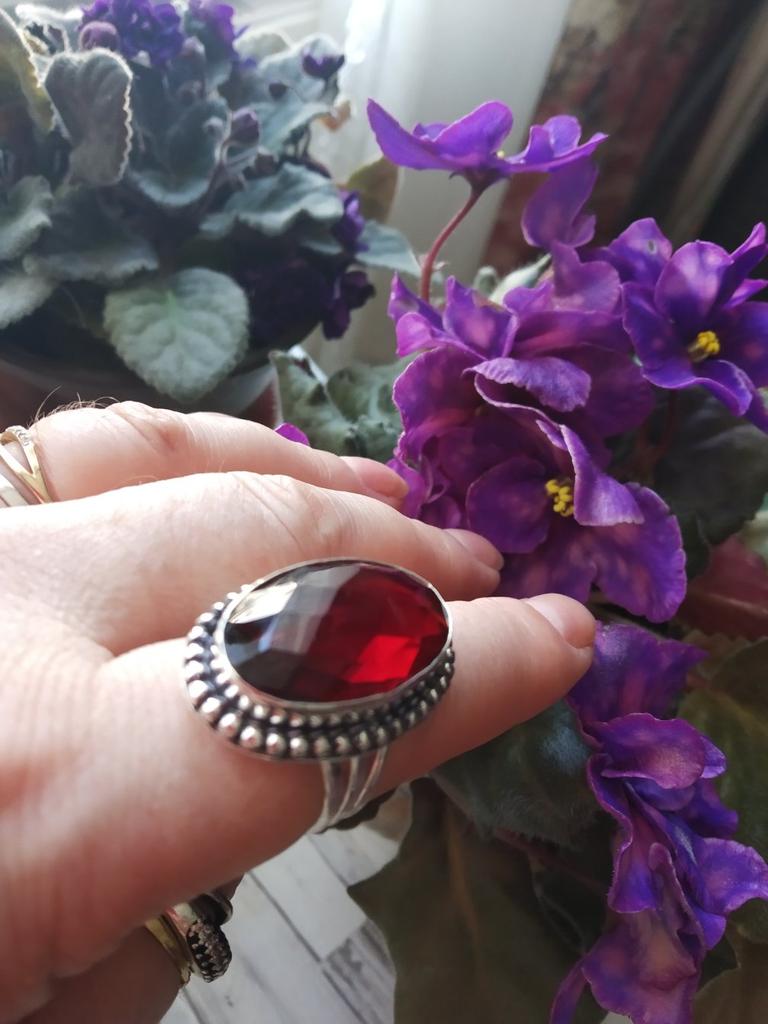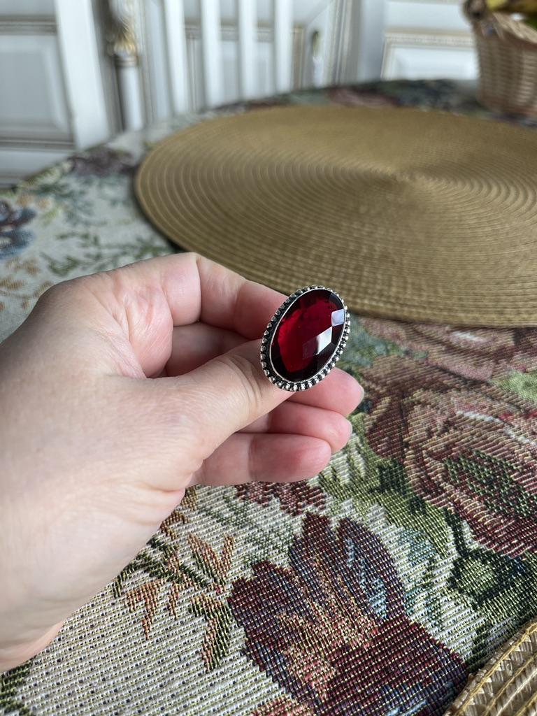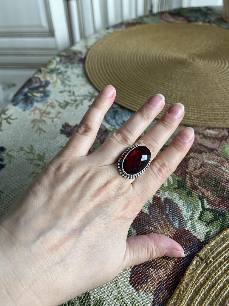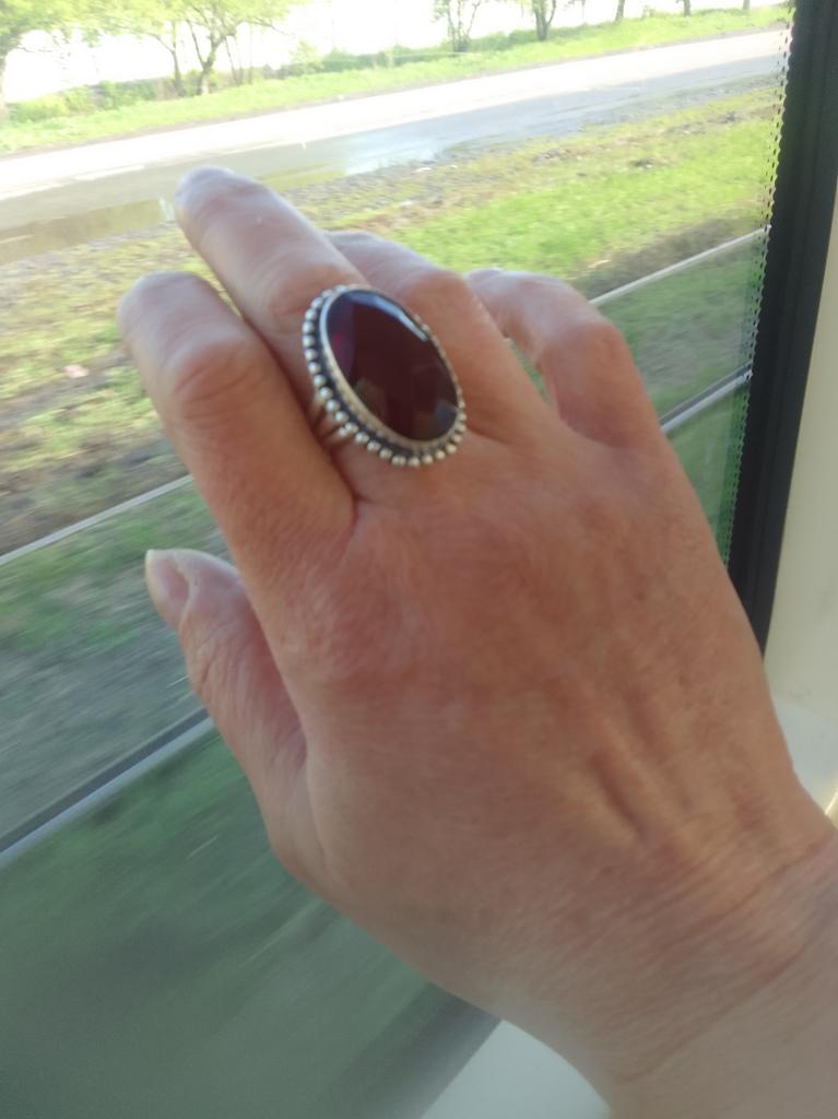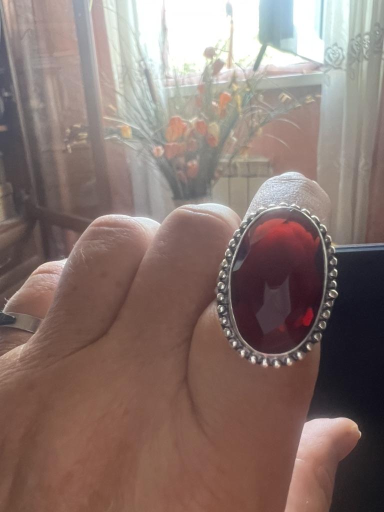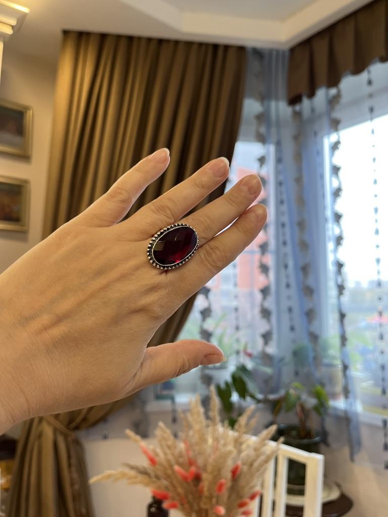 Incomparable large ring with garnet in a silver setting. The ring size corresponds to the ordered one. High-quality work. Ring size - 2.9 cm × 2.0 cm. Stone size - 2.0 cm × 1.5 cm. The wonderful stone sparkles, shimmering in the light! Bravo to the jewelers! There is a 925 sterling silver hallmark. The ring is simply a miracle!
