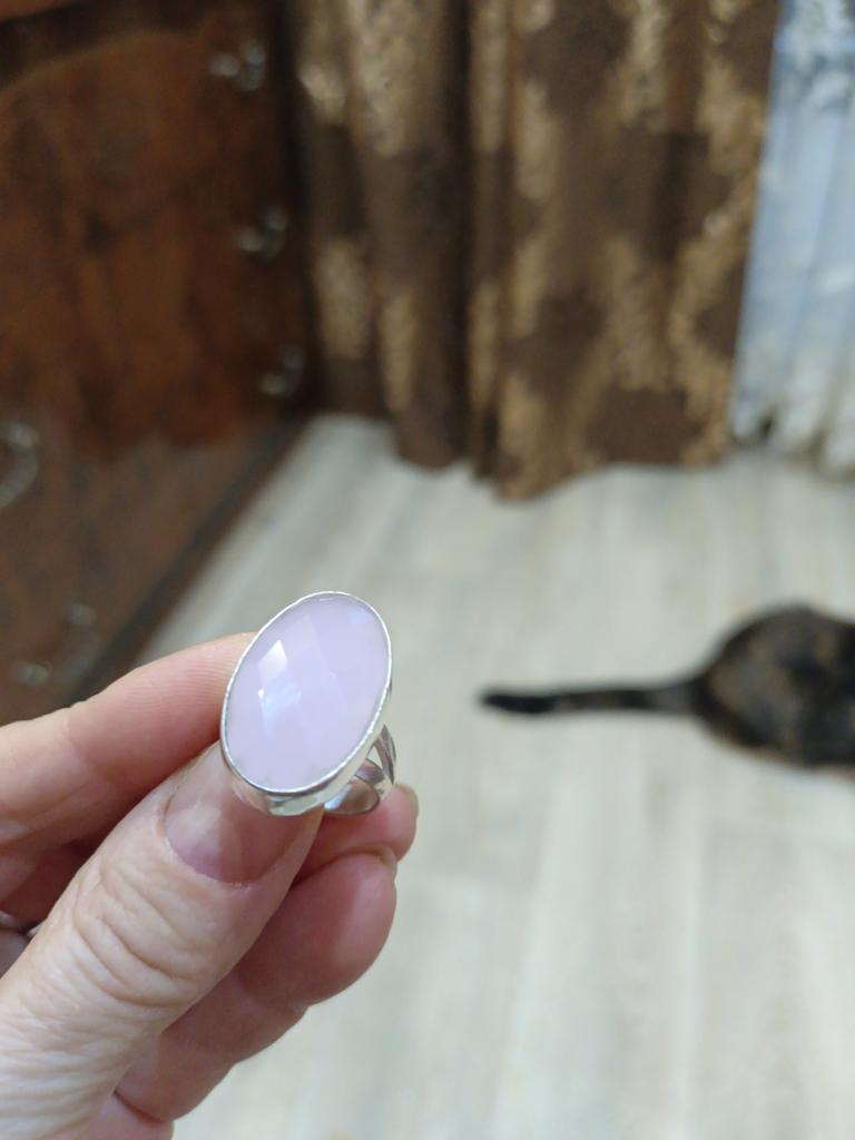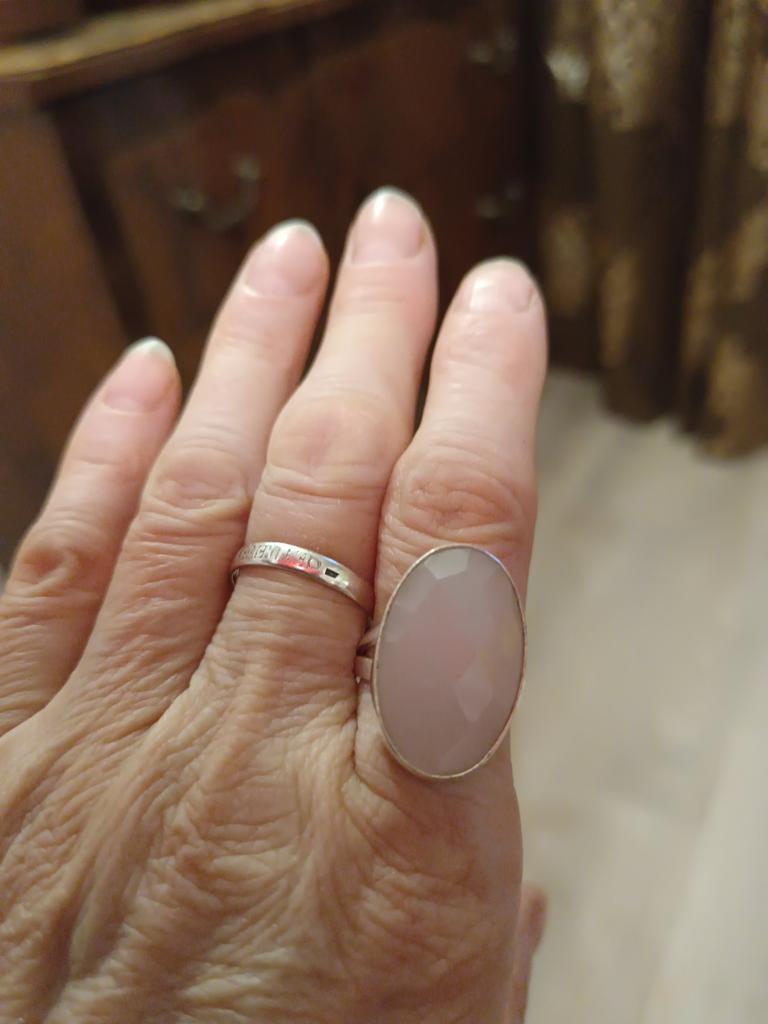 Delicate, beautiful, silver ring (sterling mark is present) with pink chalcedony, size matches the ordered one. High-quality craftsmanship. Stone size 2.5 cm × 1.6 cm. A wonderful purchase.