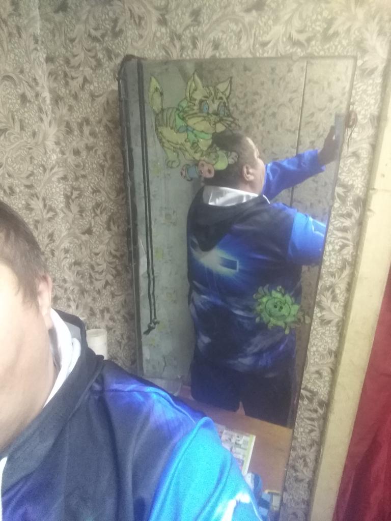 The material is polyester, the pattern is bright, rich. I took 5XL, I needed a size smaller, the sleeves are very long, the shoulders are fine.