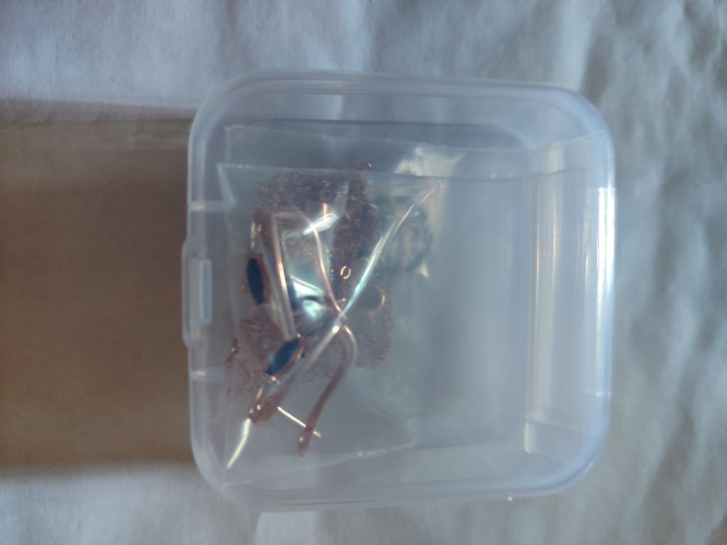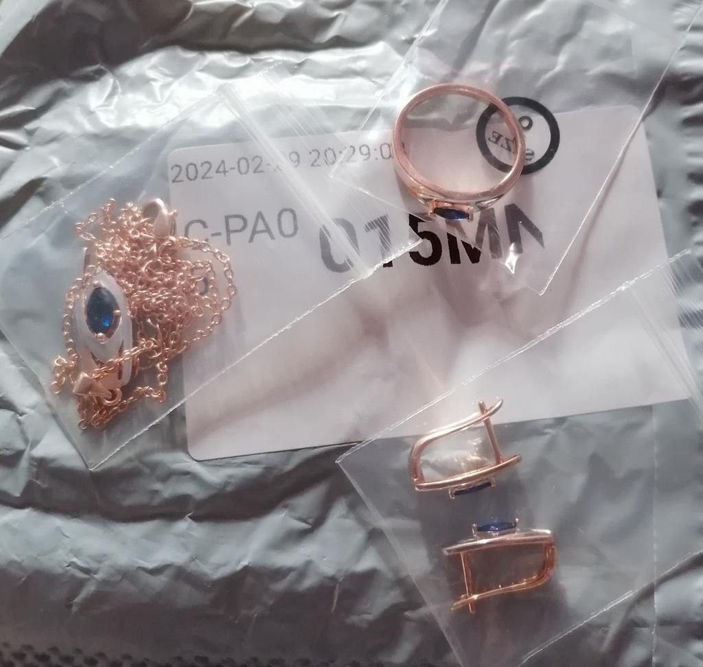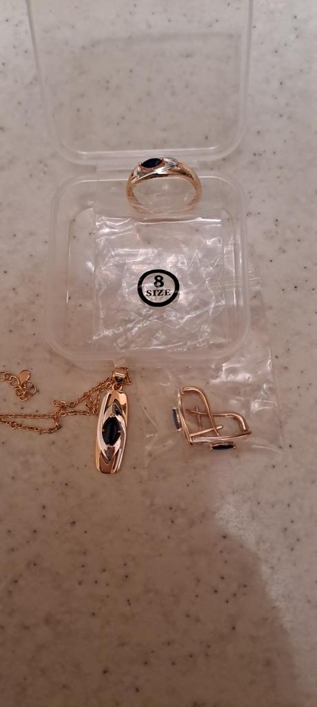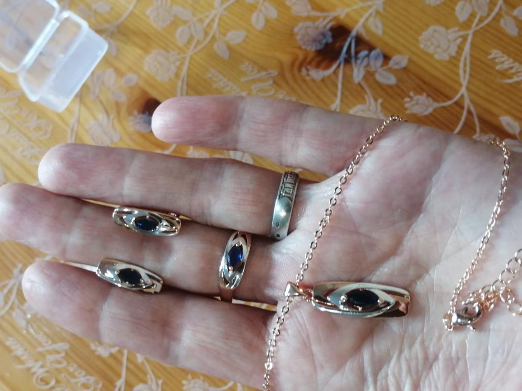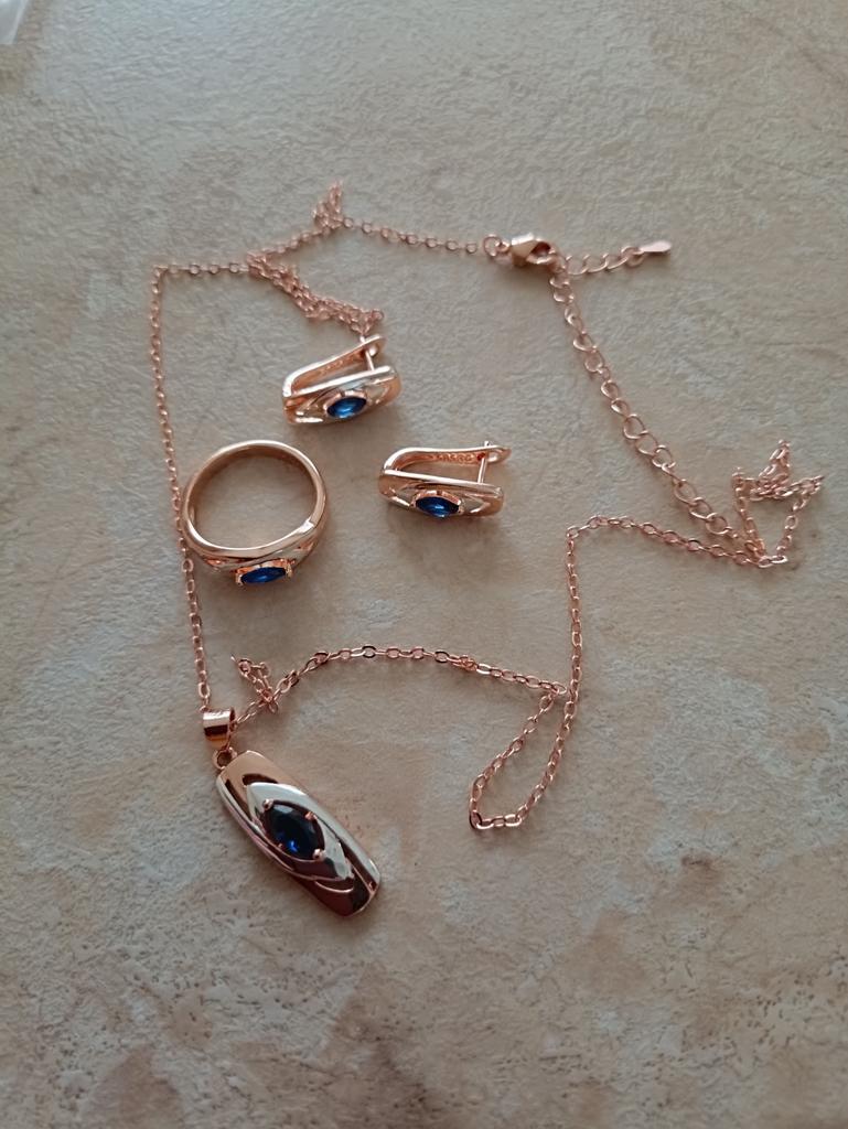 I rarely write reviews, although I like to read them myself, but I decided to do it this time. The set is very beautiful. It stands out with good quality. Rose gold combined with silver and a dark blue eyelet creates a beautiful composition. It is known that it is not original gold and silver, but it looks divine. I sincerely recommend the purchase. I only hope that the quality of the coating is good and will not change color to black, which I wish for myself and other buyers of this set. Thank you for the quick shipping and nice packaging.