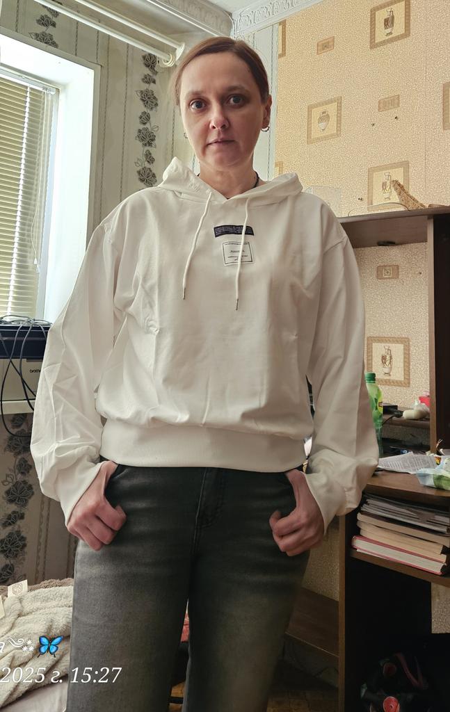 Very nice sweatshirt with a hood😍 just love at first sight! The fabric is not thick, but that's what I wanted. Keeps the form!