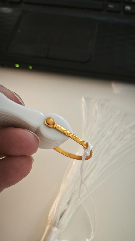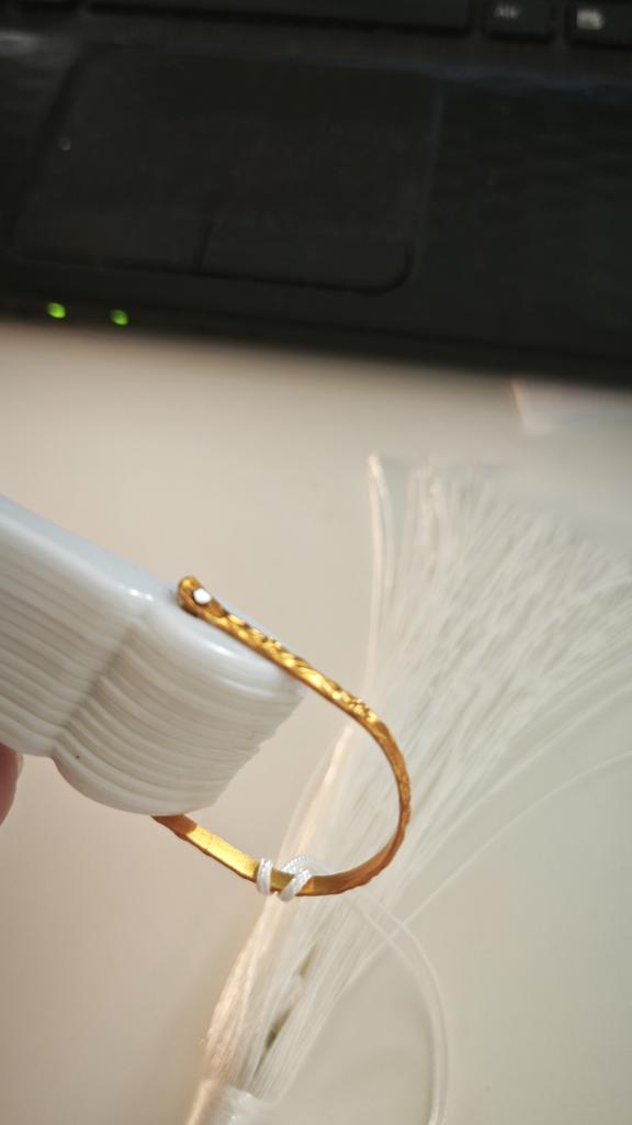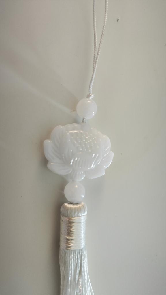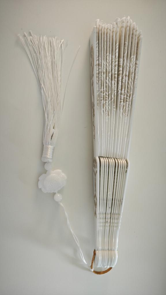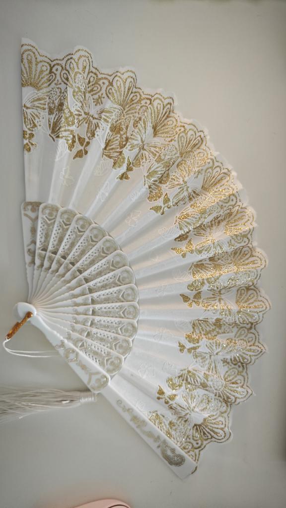 A large beautiful fan with a gold and white pattern. Black. I ordered brown. With a loop.