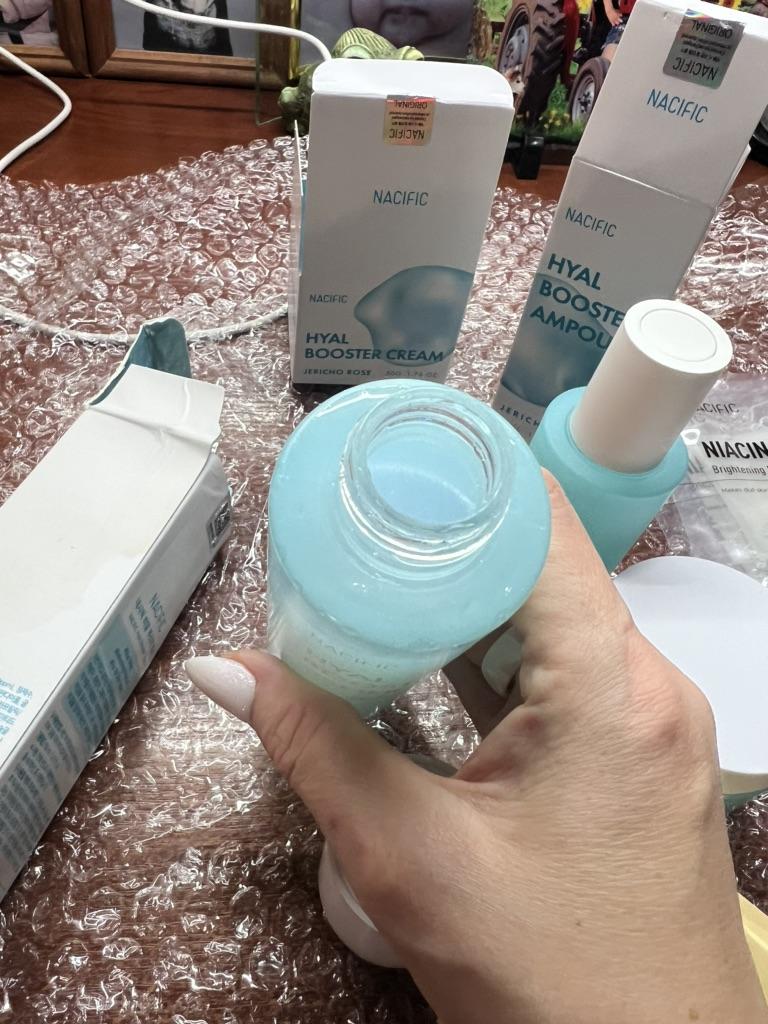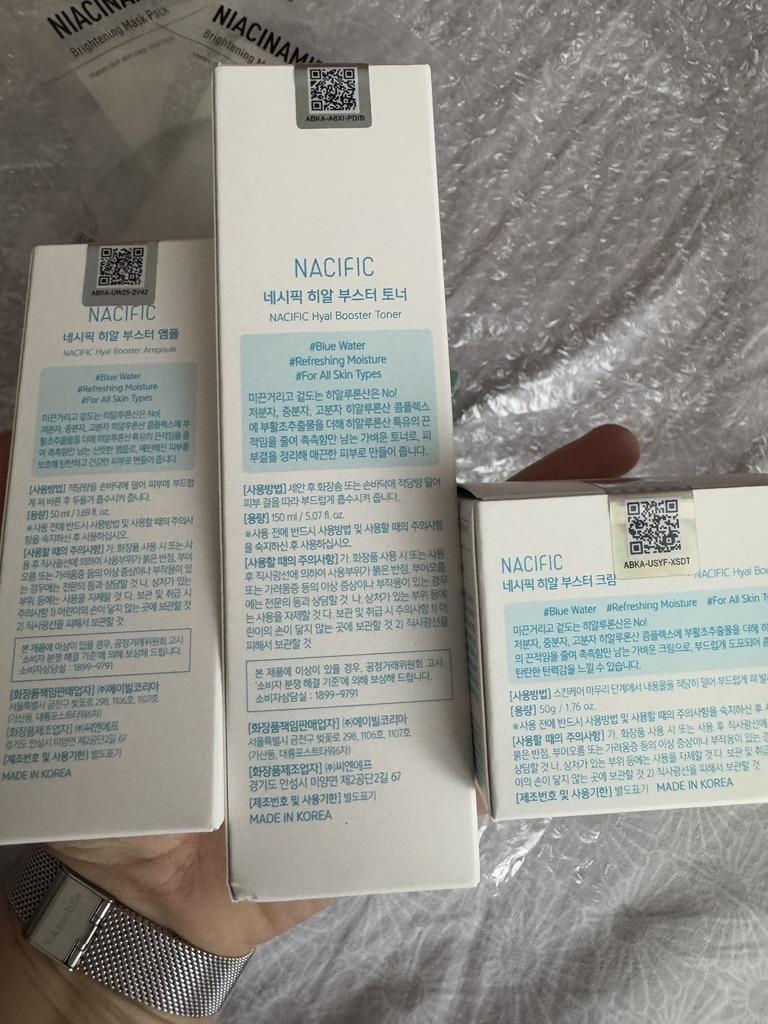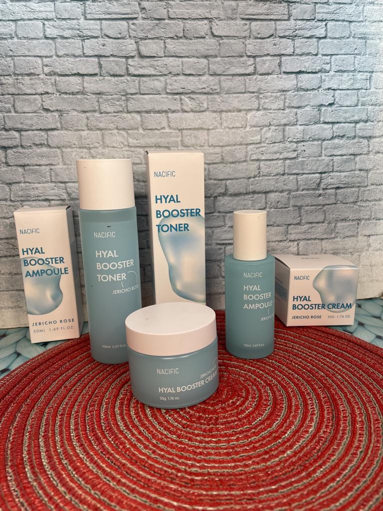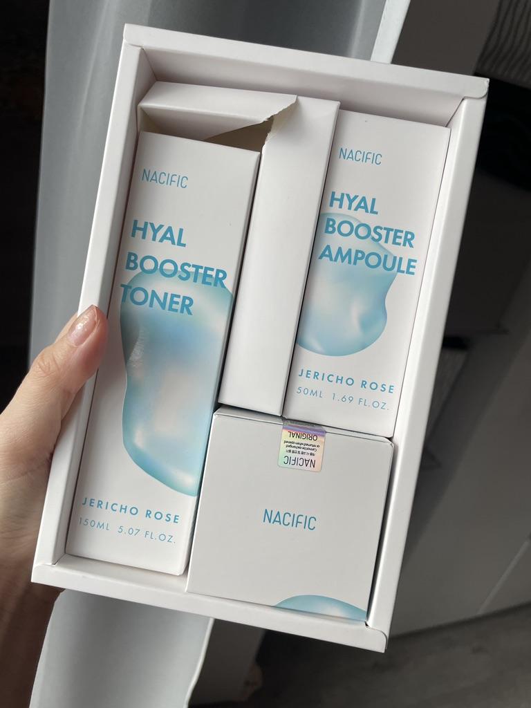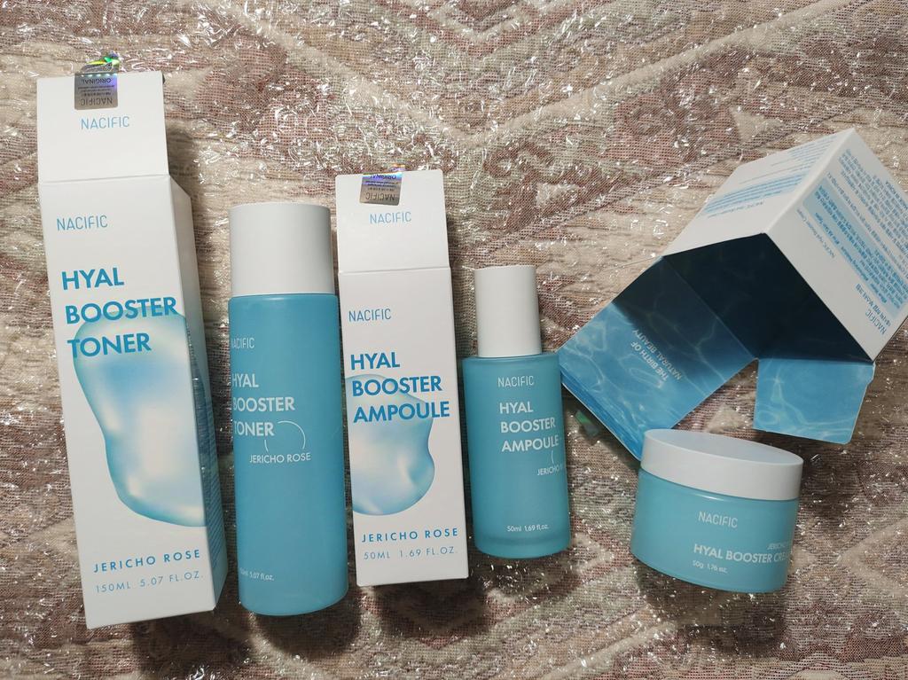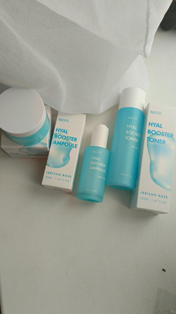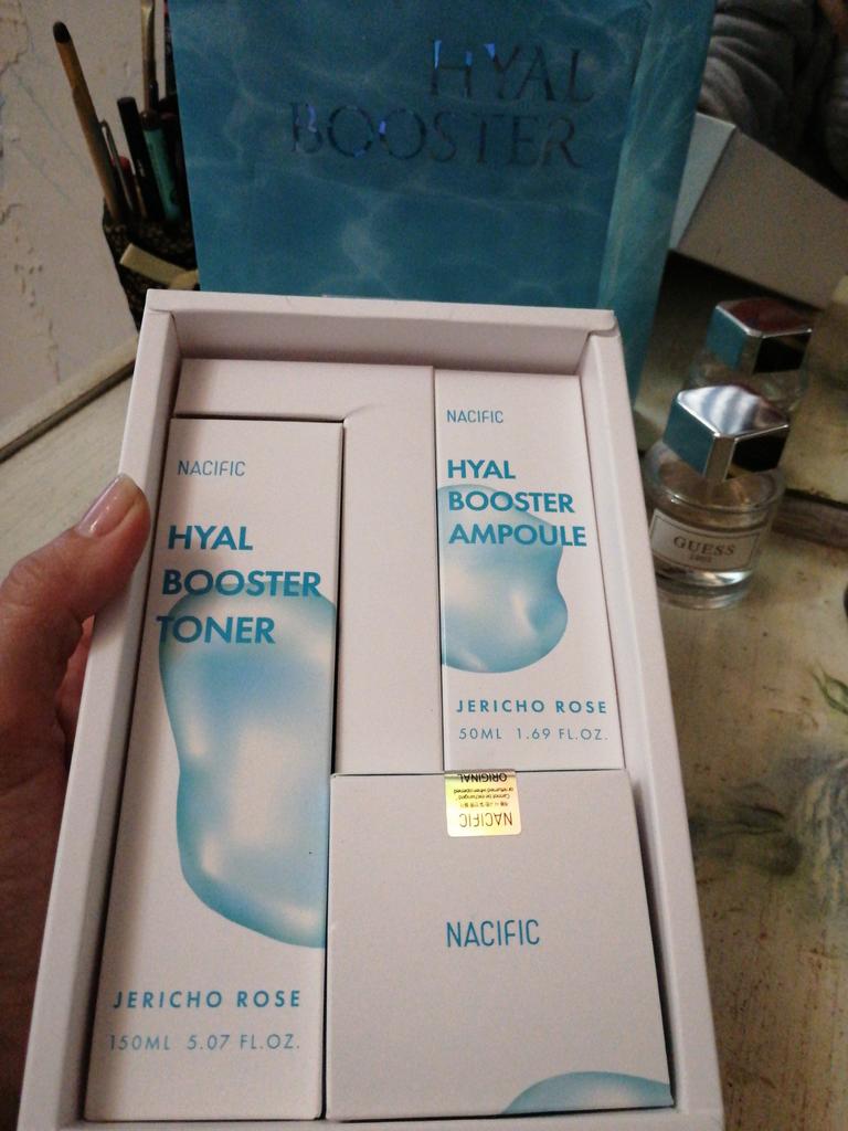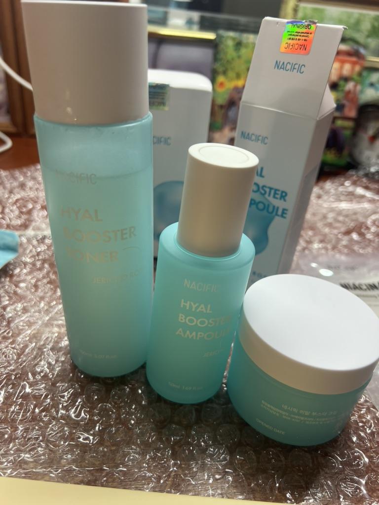 Hyal Booster Set (Toner, Ampoule, Cream + Gifts, NACIFIC Moisturizer Glowing Fresh Skin To start with, it's Korean products. Today I'm renewing the comment. It's a great product. High hydration and tightens the face. I have combination skin and this product was suitable for me and I benefited from it. Goodbye to dry and dull skin and hello to radiant and moisturized skin with Hyal Booster Ampoule. Used: Step 1: After washing your face, use toner to soften your skin.. Step 2: Take an appropriate amount of cream and spread it smoothly on the face and neck.. Step 3: Gently pat your face with your hands to allow it to absorb.. Shipping from 1 to 3 weeks The packet is properly protected against breakage.