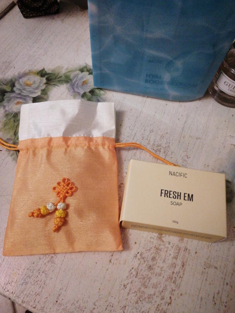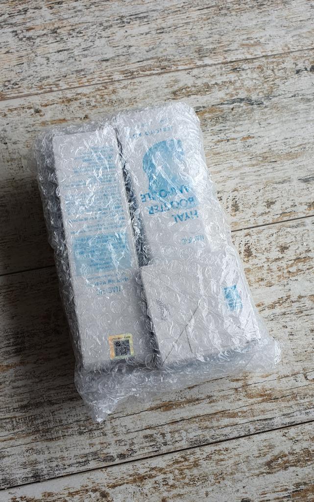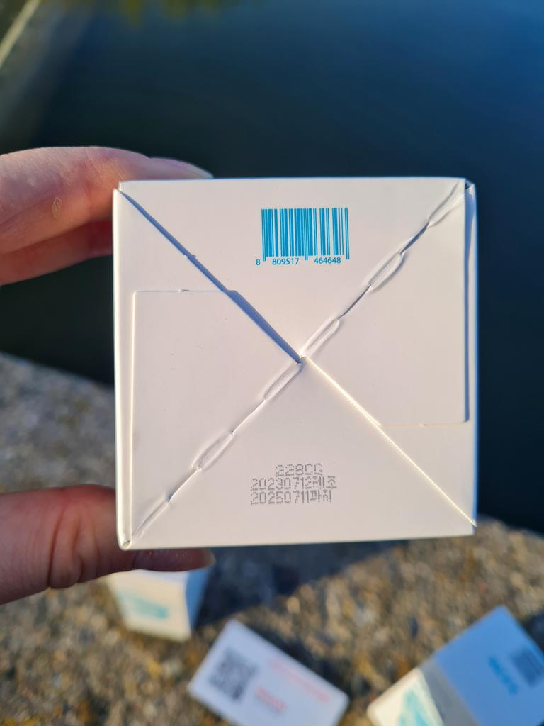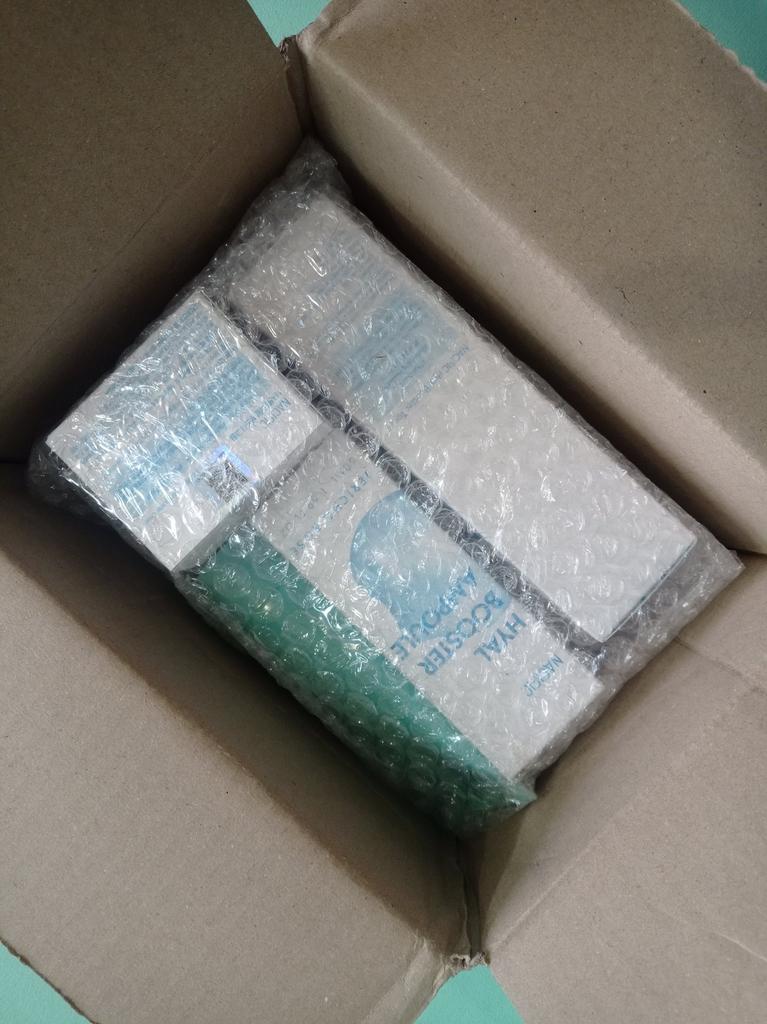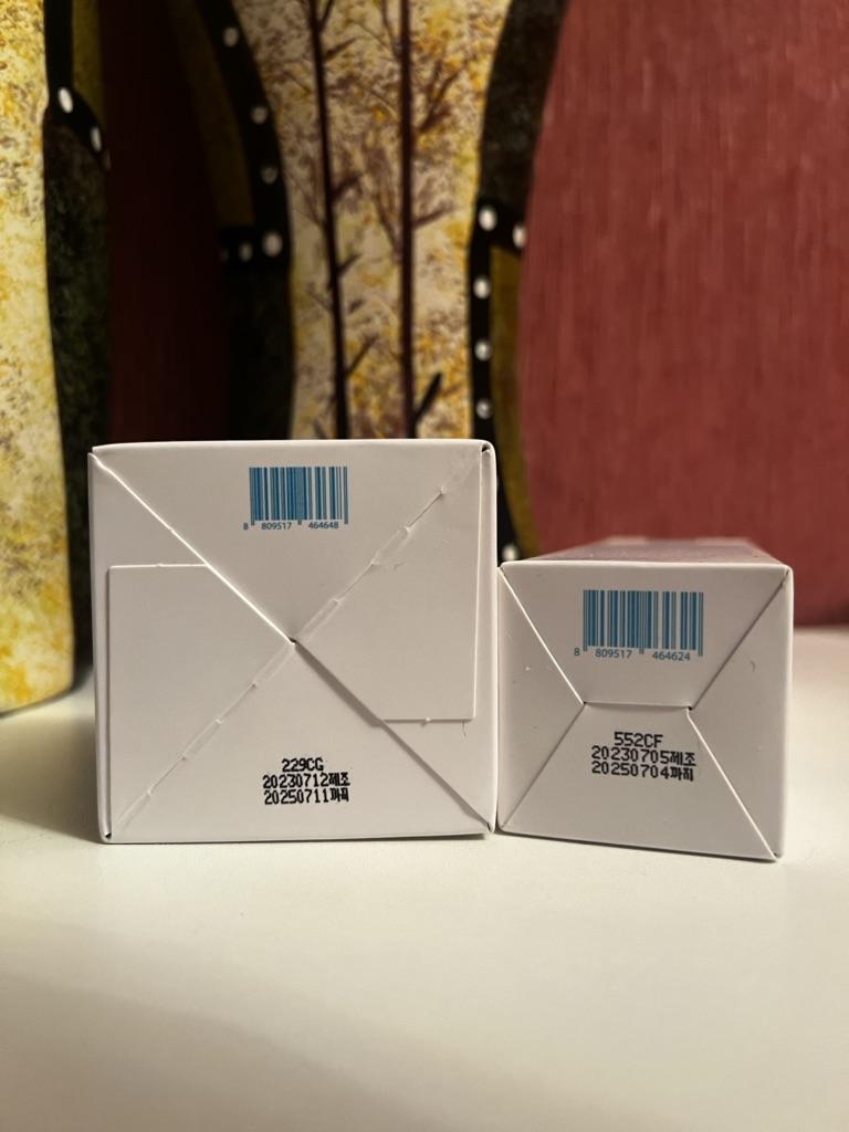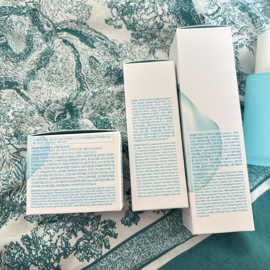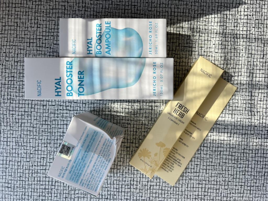 Slightly damaged box but the products are intact, that's the most important thing! I reordered a batch because I really enjoyed this Korean routine, with a little extra gift this time "fresh herb" origin eye cream with calendula... Very appreciated! Thank you