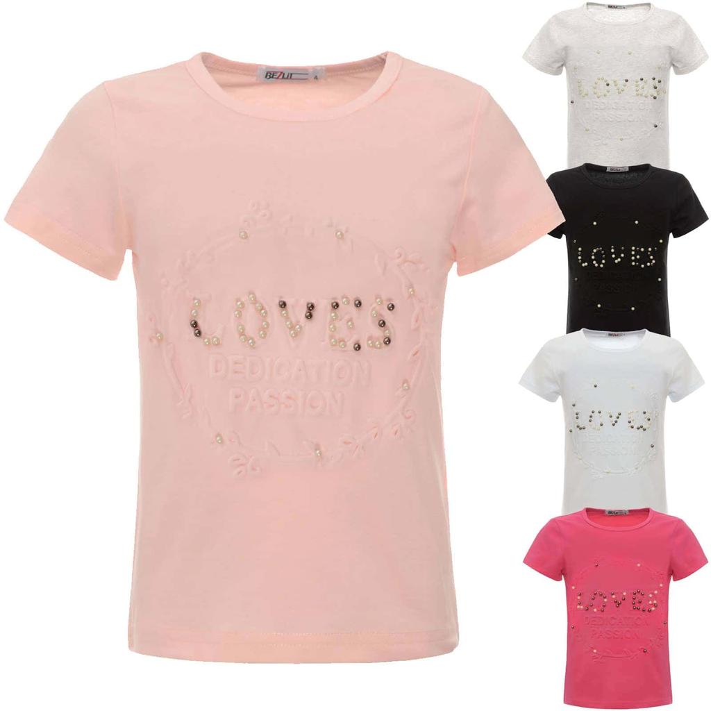 Girls Summer T-shirt with Faux Pearls and Print Motifs